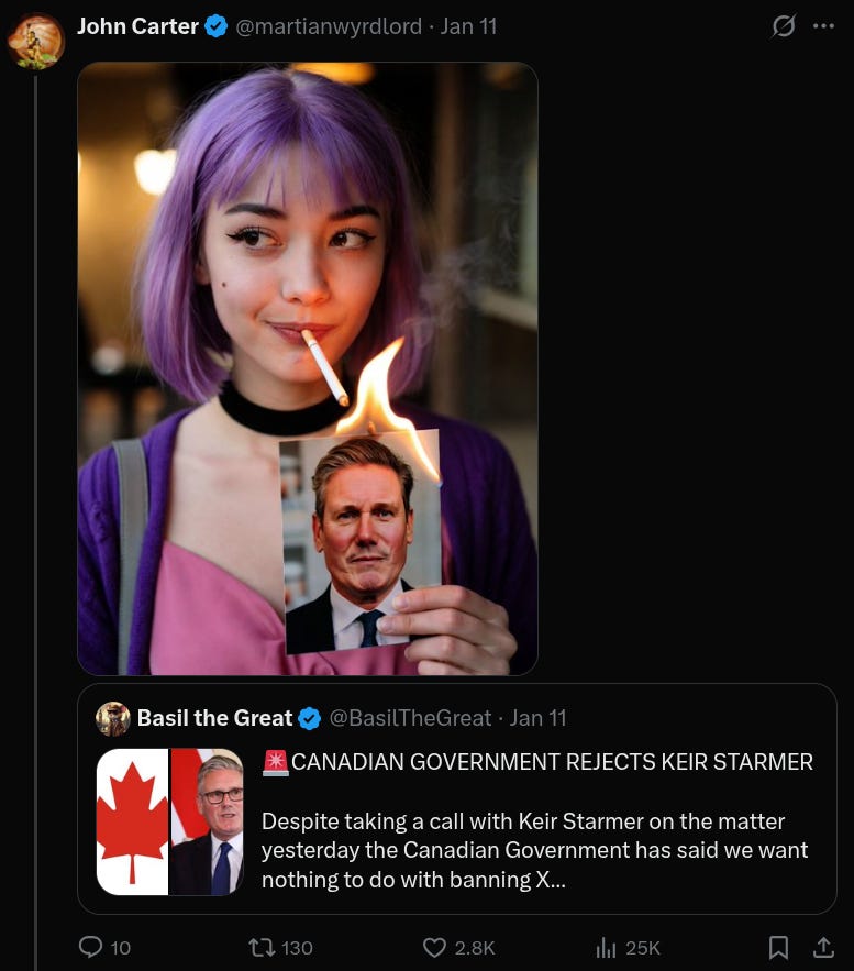 Since control is impossible, the best the managerialists can do is to try to Prevent. They can arrest people for posting racist or transphobic memes, a habit in which the British government has indulged to an almost unparalleled degree to little avail. They can even ban entire social media or AI platforms, or at least try to: VPNs make a joke of that, in practice. Around the same time that Amelia was summoned, Starmer’s Labour government was making noises about banning Grok because people were using it to dress women in bikinis against their will, and was also in talks with the Canadian and Australian governments to ban X entirely.