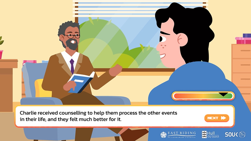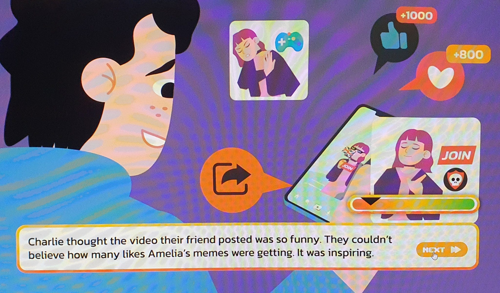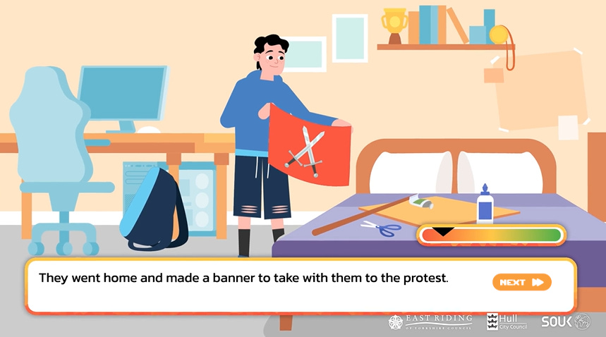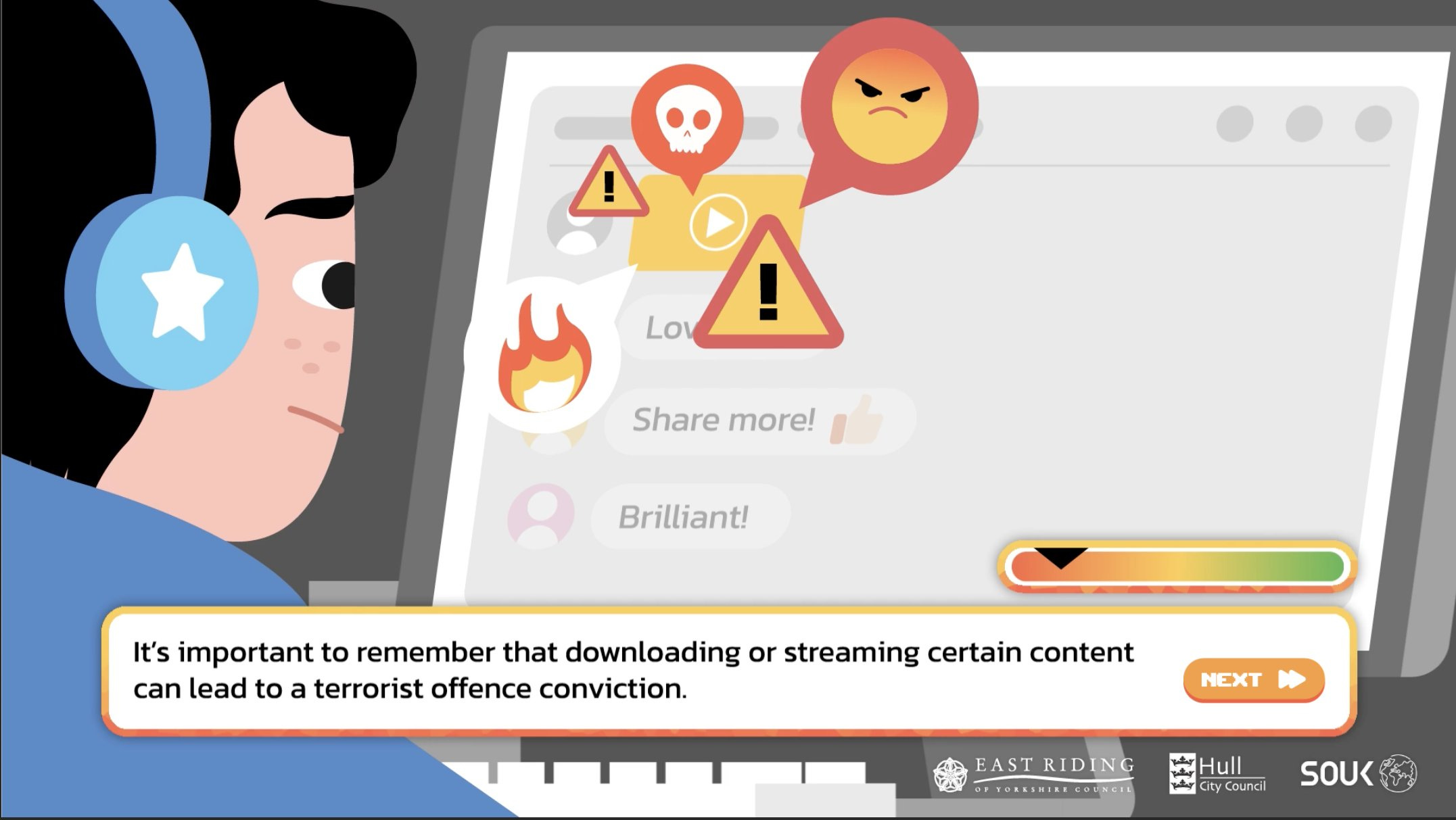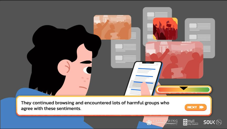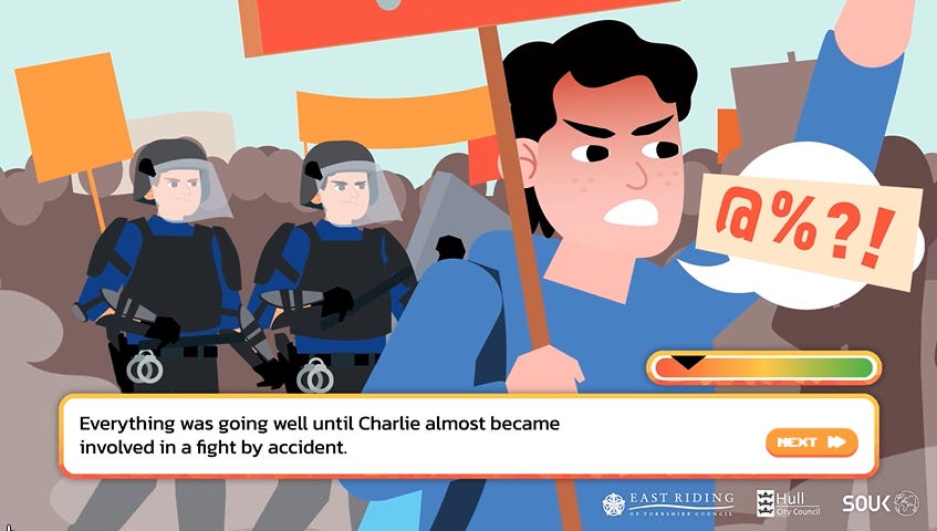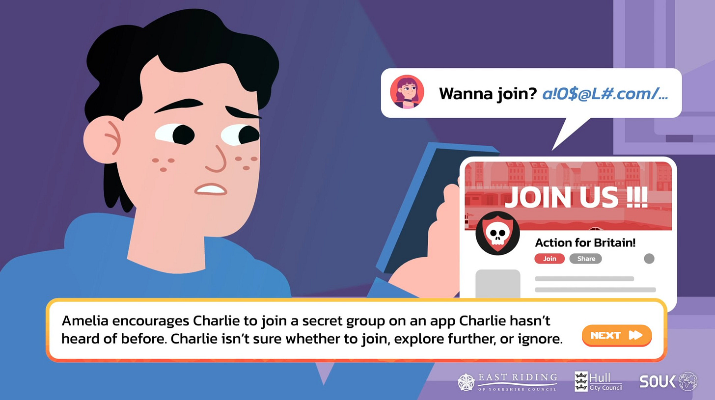 The player can choose either a male or female character, both of whom are amusingly and awkwardly referred to with they/them pronouns, with grammatical abominations such as “Charlie decided to look for themselves” sprinkled throughout. The character is then placed in a series of scenarios and made to choose between good and bad options: downloading extremist content or telling an adult; agreeing with a classmate that ethnic minorities are being shown favouritism at the expense of native youth vs clapping back at her unconscionable bigotry; watching a video and reading more about the subject or ignoring it; accepting or refusing an invitation to join a secret group chat; attending an anti-immigration rally or staying home. If you make the bad choice, a little ‘extremism metre’ goes into the red.
