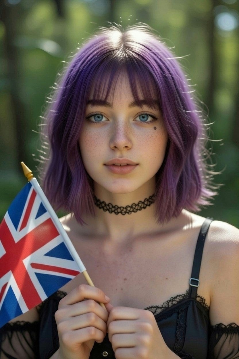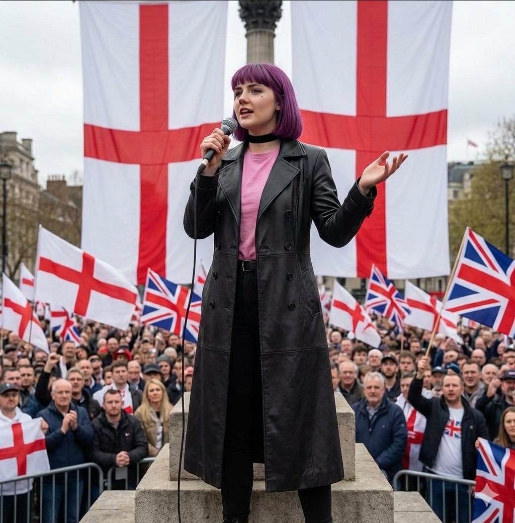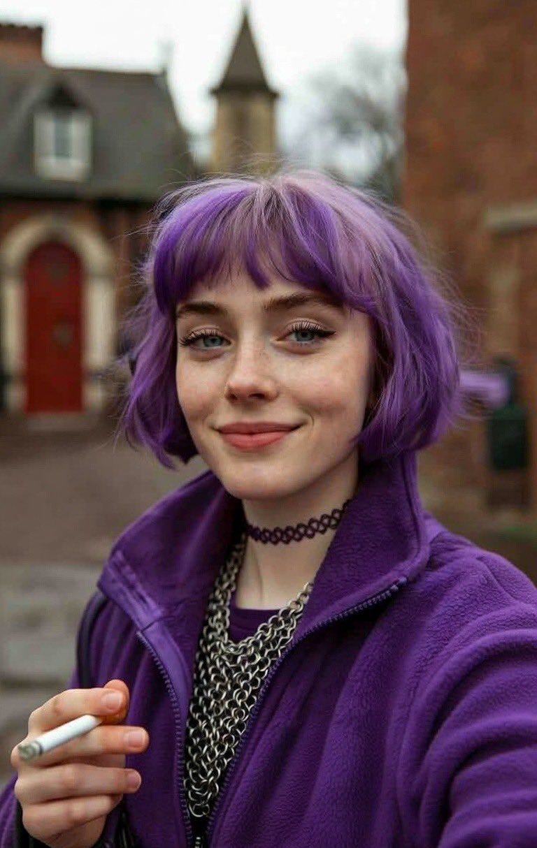 Amelia’s explosive popularity seems out of step with the image of the right as conservative and traditionalist. This may be what led to Shout Out UK’s fortuitous misstep in the first place (assuming that Amelia wasn’t just the creative director’s shadow persona self-insert, which is distinctly possible). Rightists, they may have reasoned, are generally hostile to the aposematic fashions beloved of the left’s gender-ambiguous hall monitors. Reactionary Christian conservatives prefer their girls to be demure, submissive, and modest; they dislike tattoos, piercings, and brightly coloured hair. By associating nativist extremism with a purple-haired alt girl, they’ll drive the chuds away from racism! It’s brilliant!