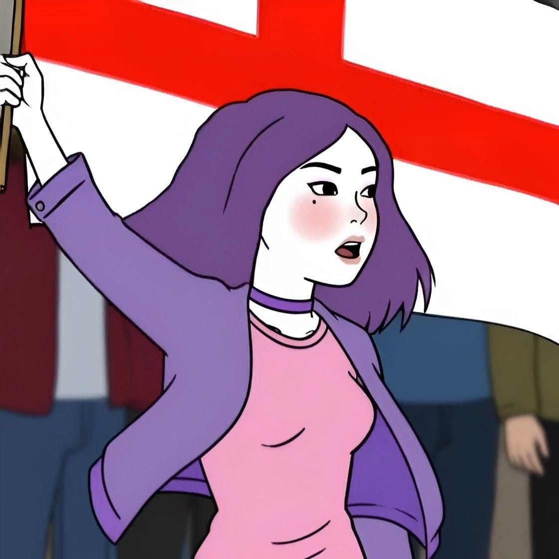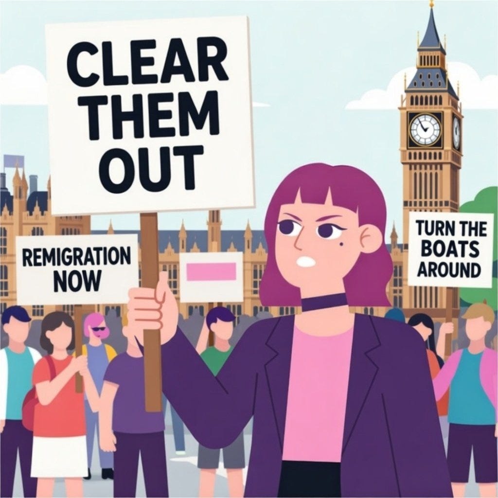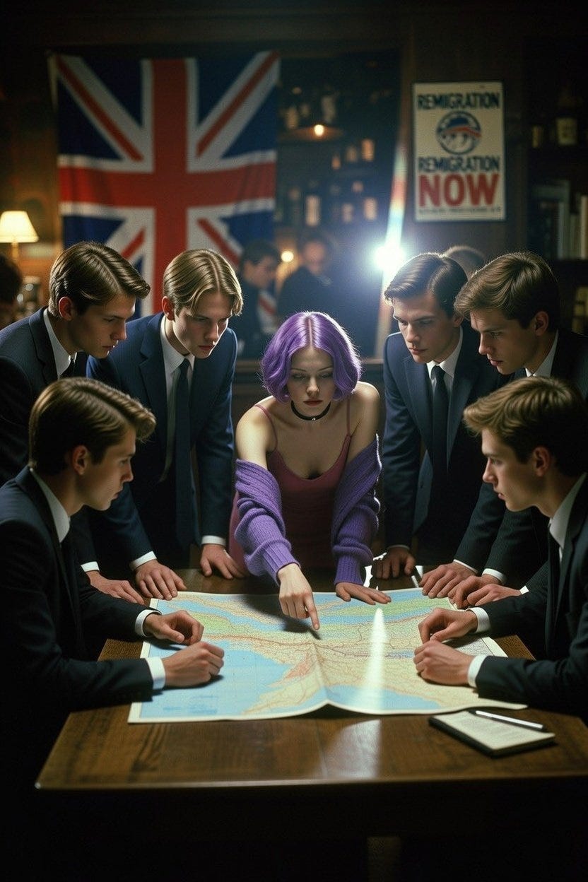 Amelia’s explosive popularity seems out of step with the image of the right as conservative and traditionalist. This may be what led to Shout Out UK’s fortuitous misstep in the first place (assuming that Amelia wasn’t just the creative director’s shadow persona self-insert, which is distinctly possible). Rightists, they may have reasoned, are generally hostile to the aposematic fashions beloved of the left’s gender-ambiguous hall monitors. Reactionary Christian conservatives prefer their girls to be demure, submissive, and modest; they dislike tattoos, piercings, and brightly coloured hair. By associating nativist extremism with a purple-haired alt girl, they’ll drive the chuds away from racism! It’s brilliant!