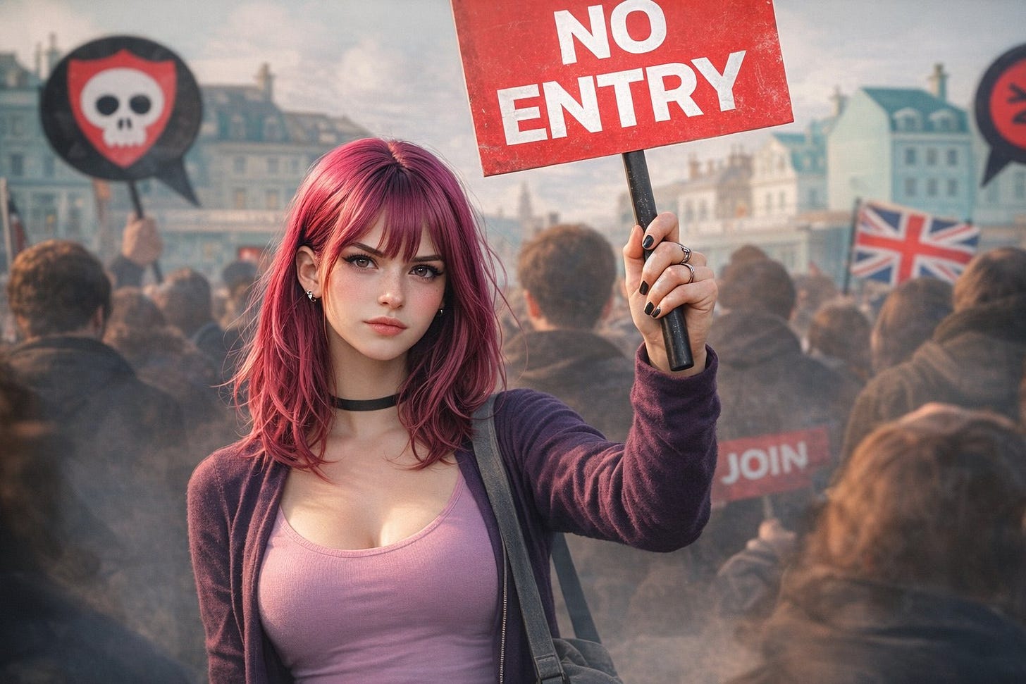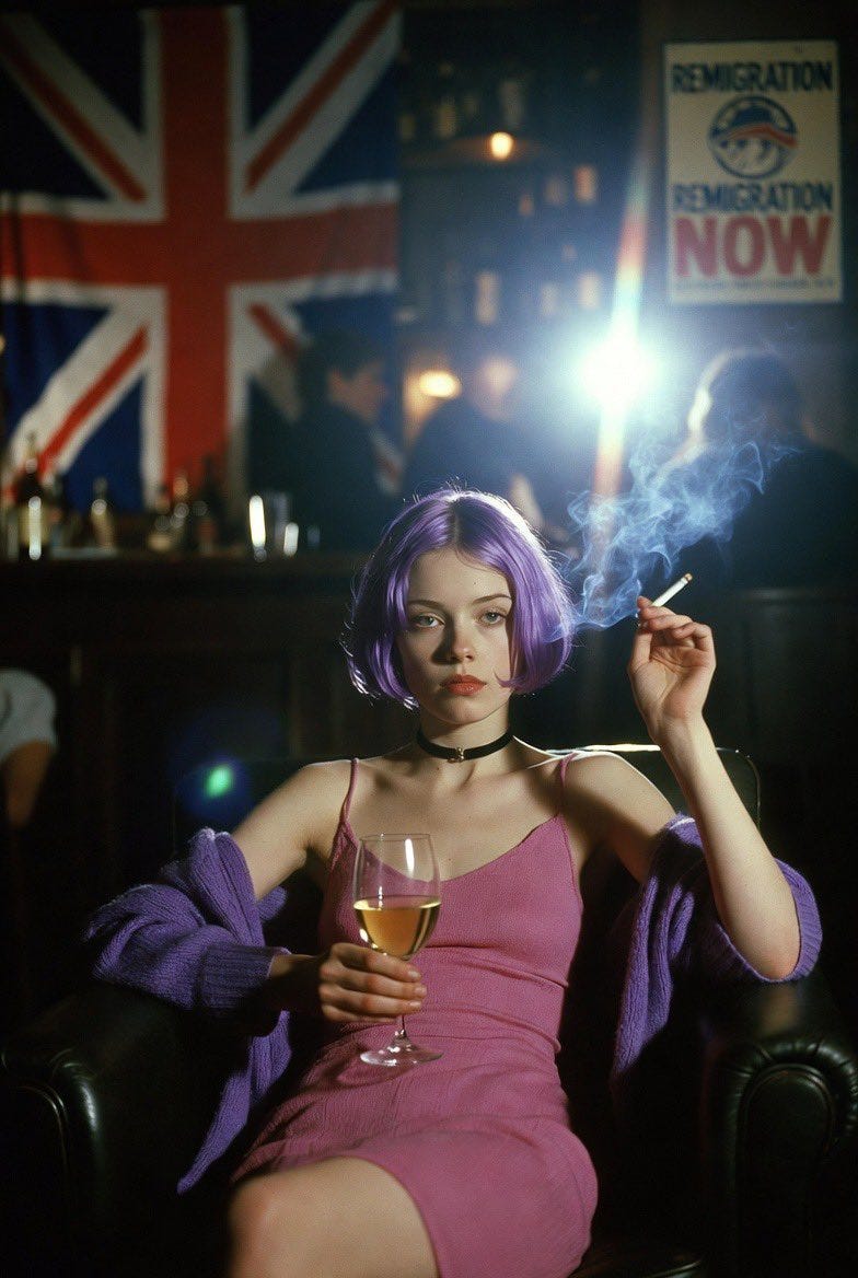 Amelia’s resonance is a function of her subversion of contemporary sartorial norms, which code Manic Panic hair as visual shorthand for insufferable shitlibbery. Amelia as Antifa, as screeching open-borders activist, as gender warrior fluent in pronounese, would be entirely unremarkable, and indeed passe. Even the choker is more troon-coded than slut-coded these days: as many have pointed out, it hides the Adam’s apple. Such types have been around for a decade now; people are tired of them, not just exasperated but bored to the point of exhaustion. Amelia as chudette, as sweet-natured Nietzschean e-girl, as rabid remigrationist with a fag in one hand and a burning fag flag in the other, this is something unexpected, novel, and therefore interesting. The right-wing is not supposed to be visually striking, it is not supposed to grab eyeballs with loud colours, it is expected to be aesthetically dull and uninspired, it is supposed to behave and obey the rules (which were written so that it will always lose). Amelia presents possibilities that haven’t been explored yet ... if the authoritarian den mothers of the longhouse can appropriate punk rock fashions and wear them like a skinsuit ... could not a cyberpunk right do the same?