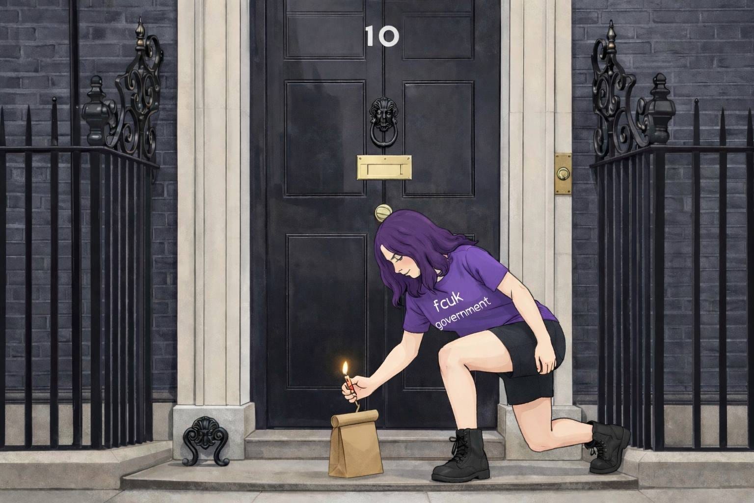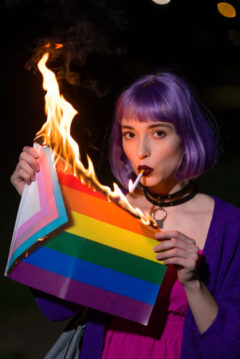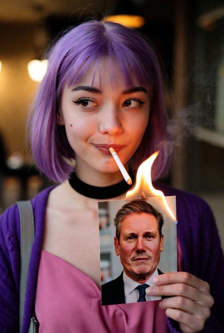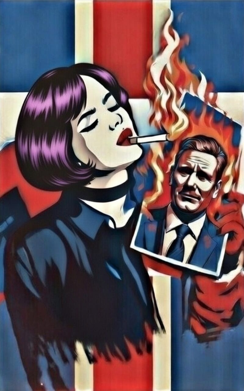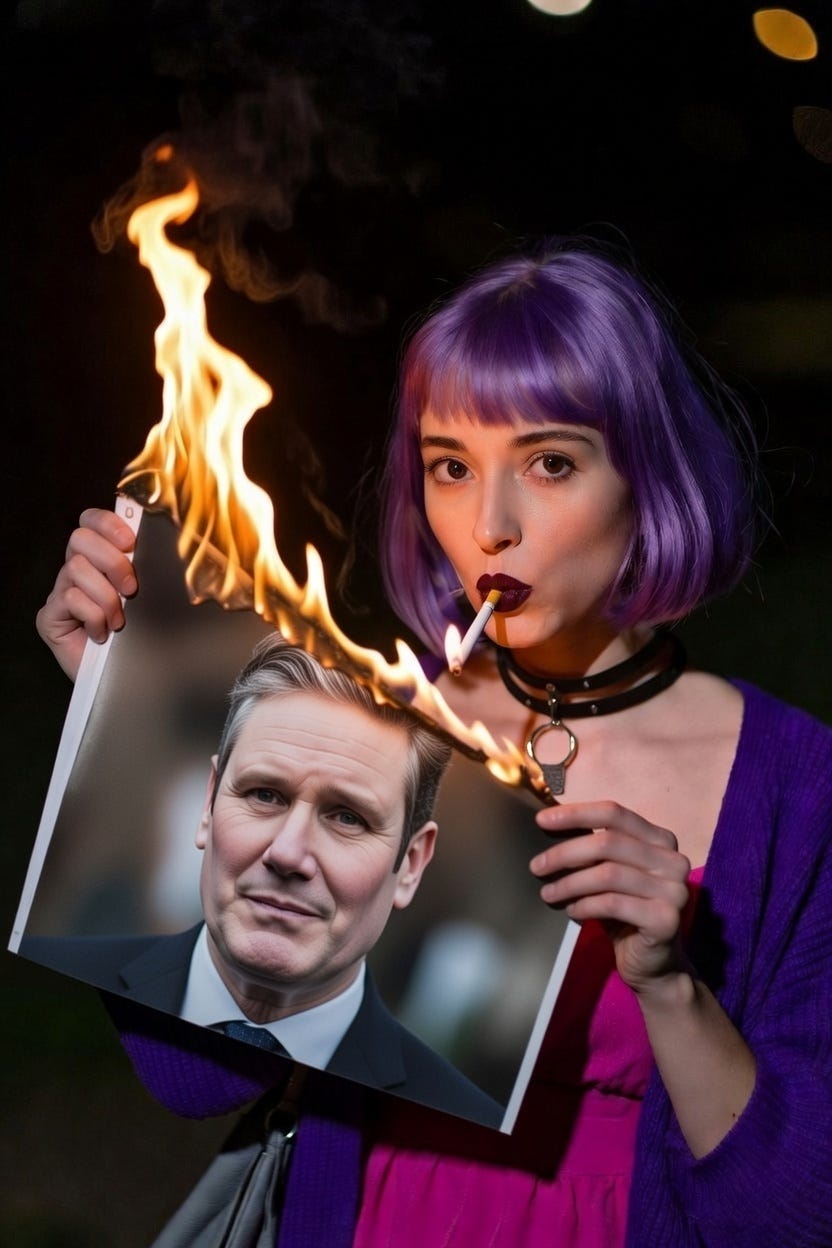 Inspired by the courageous and beautiful Persians, I made my own first contribution to Amelia, depicting her lighting her cigarette with a burning picture of Keir Starmer, or with a burning progress pride flag.