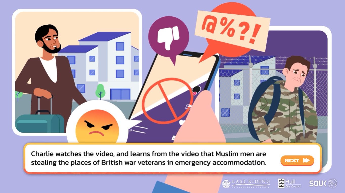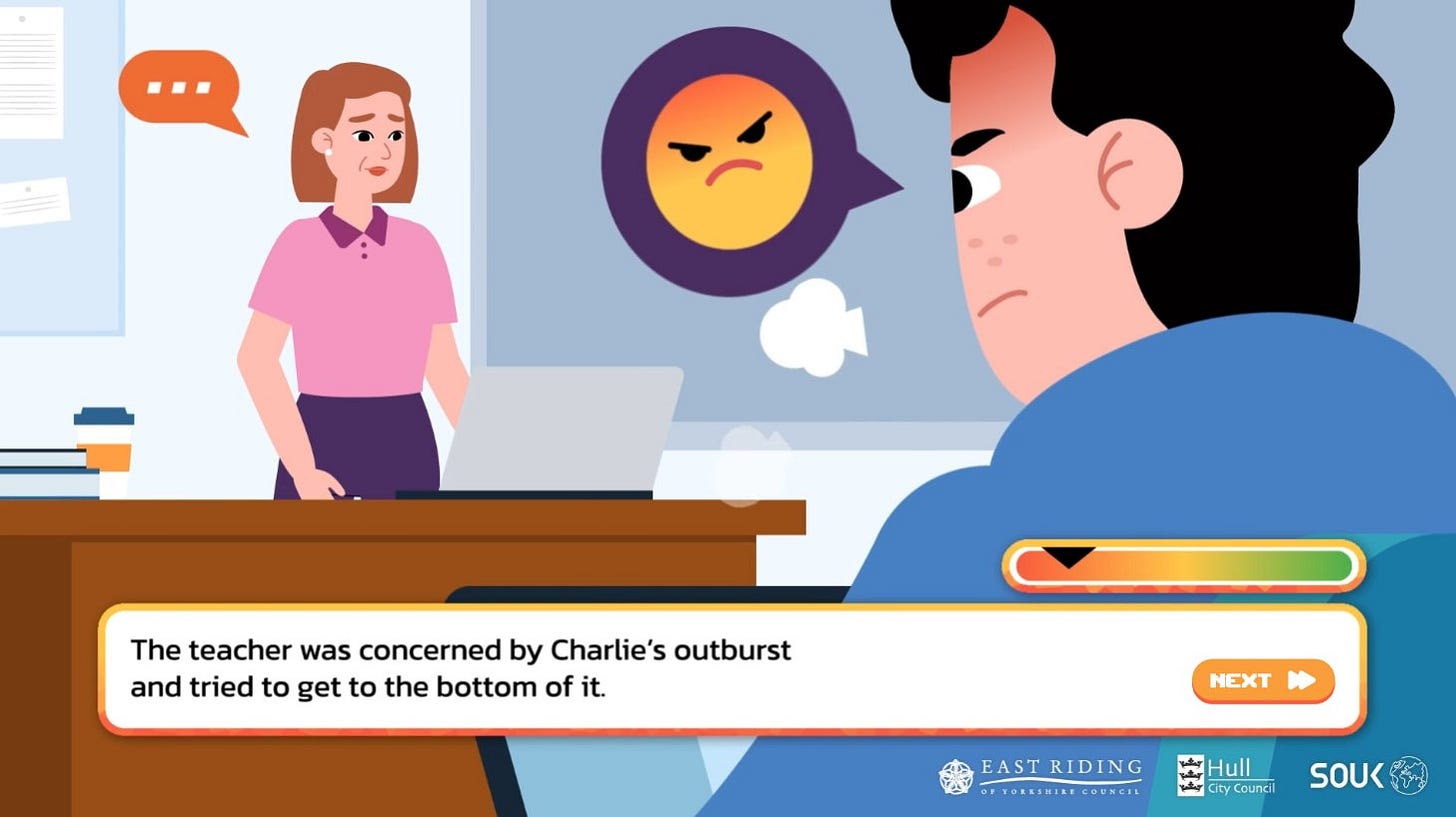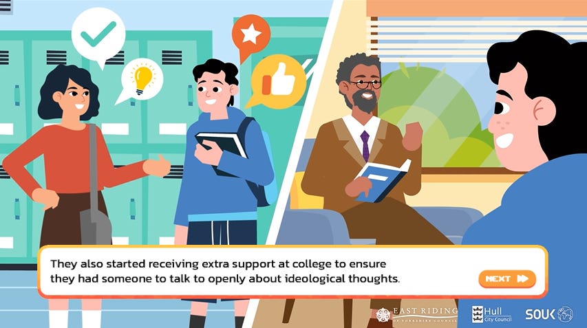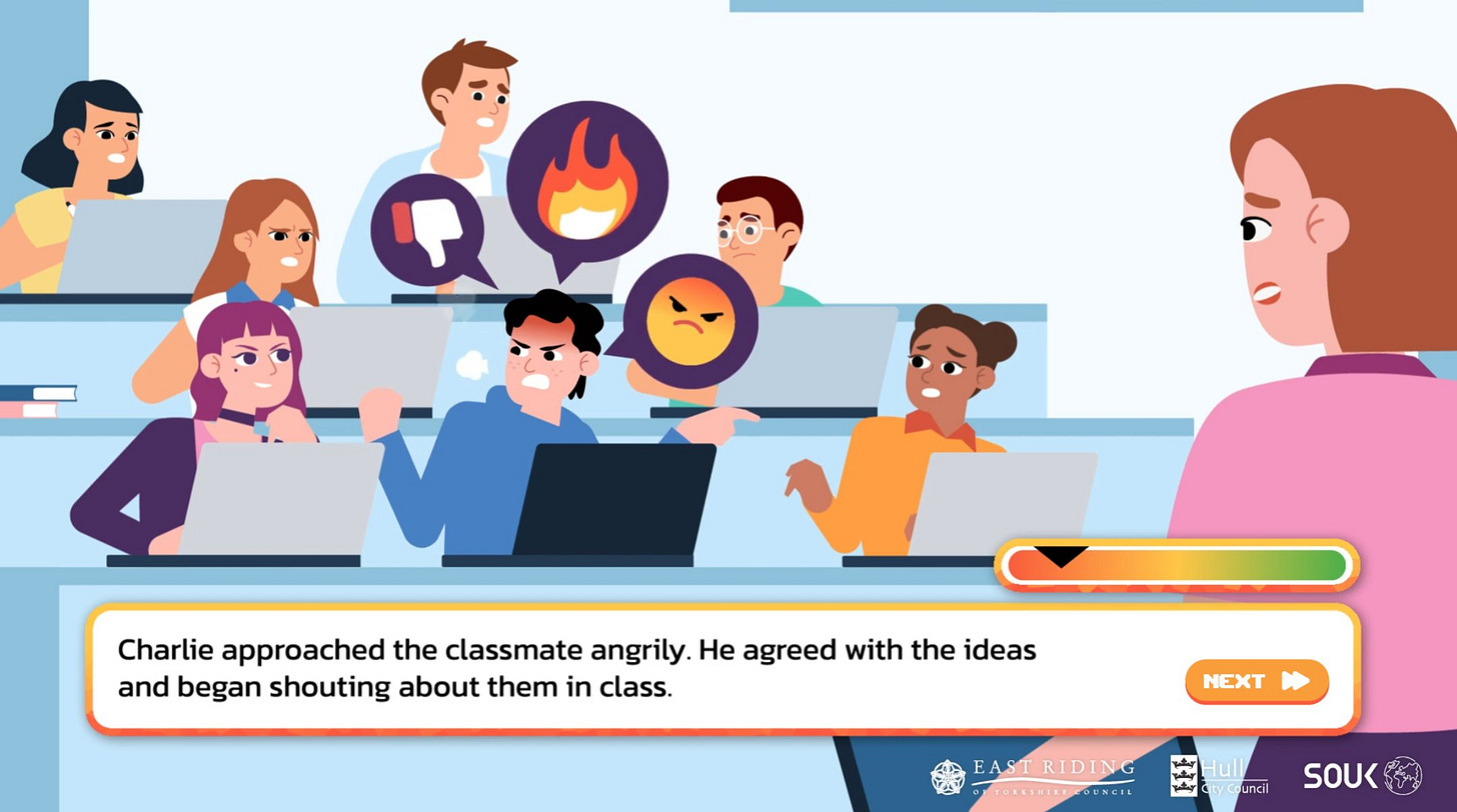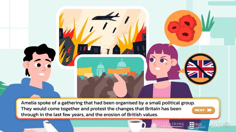 Shout Out UK, which describes its mission as ‘countering disinformation through political and media literacy’, released a ‘visual novel’ called Pathways, subtitled ‘navigating the Internet, gaming, and extremism’. The game itself is of course terrible, a ham-fisted ‘teaching aid’ intended to remind British teenagers that even innocuous and entirely peaceful activities – downloading memes, speaking your mind, watching videos, researching things for yourself, attending rallies – will complicate their lives if they draw the concerned and empathetic eye of the managerial state, which after all just wants what’s best for them.