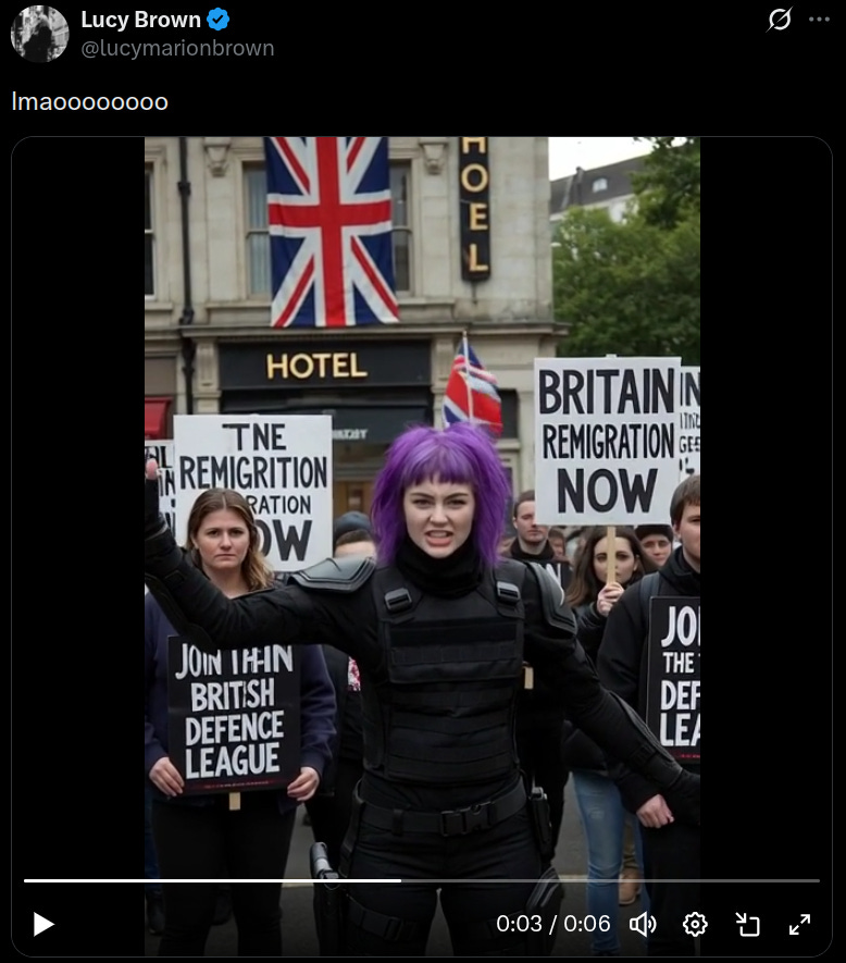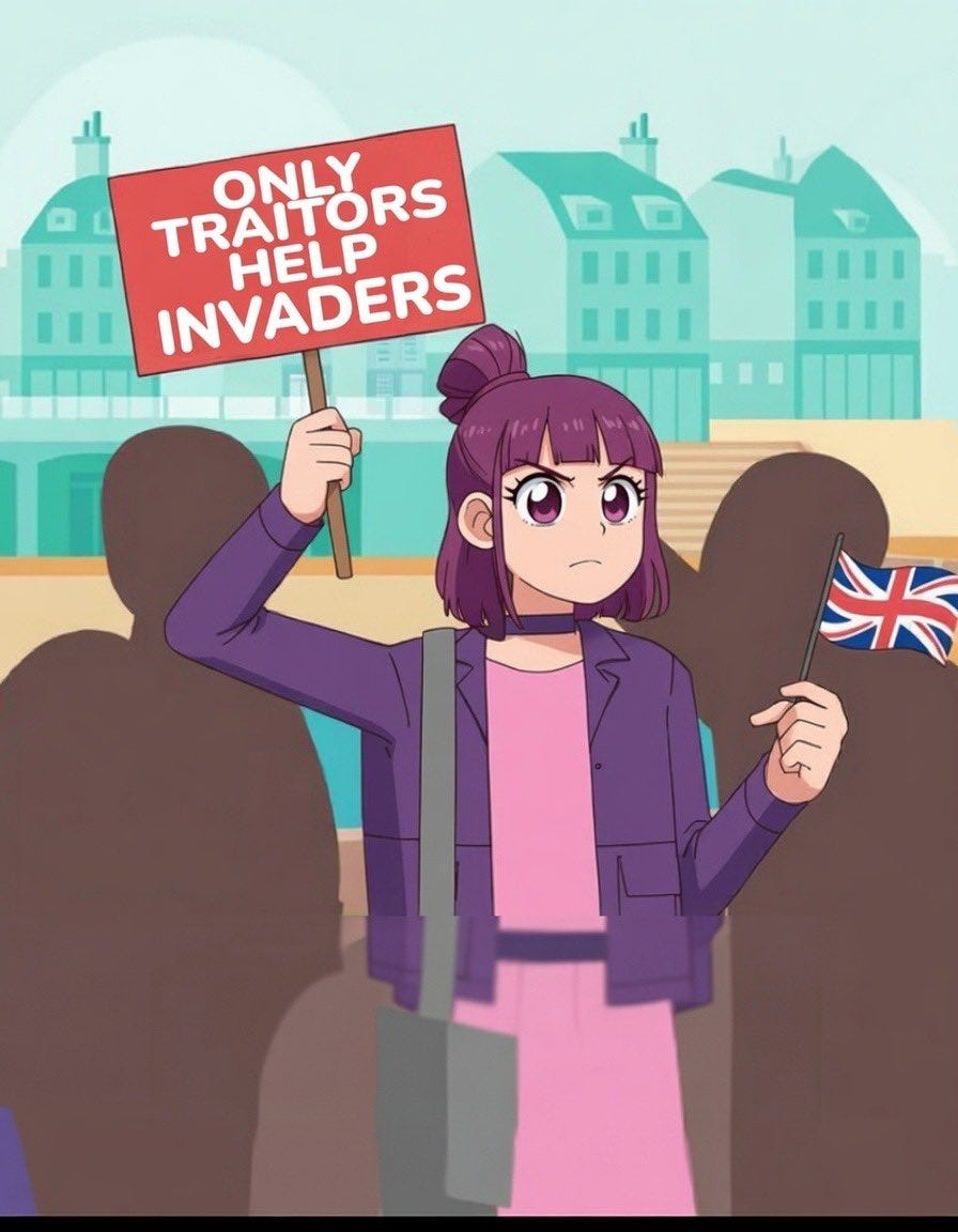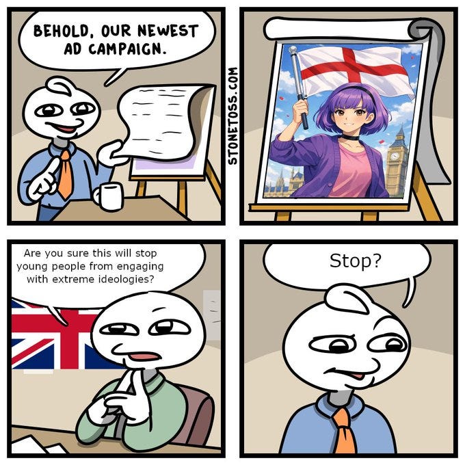 Somewhere in the bowels of the Yookay's regime, the bright spark who decided to make the "bad racist" a cutie goth gf is undergoing sensitivity training inside of an iron maiden.