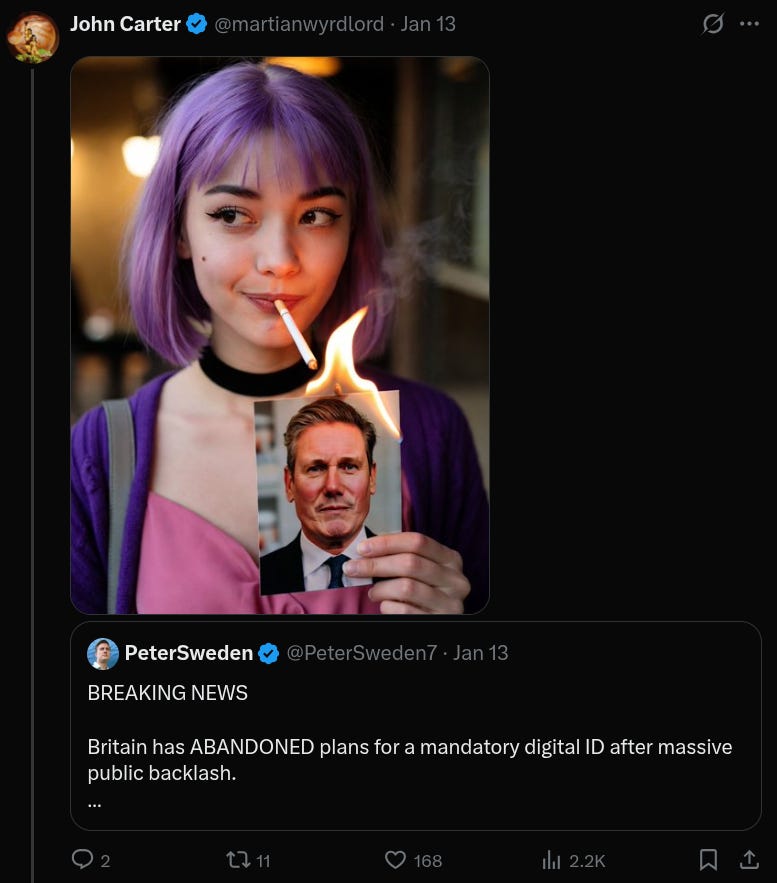 Starmer has also been talking about rolling out a digital ID, supposedly to ensure that the illegal migrants his traitors welcome and nurture at their bosom cannot legally work in the country; obviously, the real reason was so that people’s online activities could be tracked directly to their identities, and their bank accounts deactivated if they spoke out of turn. About that.