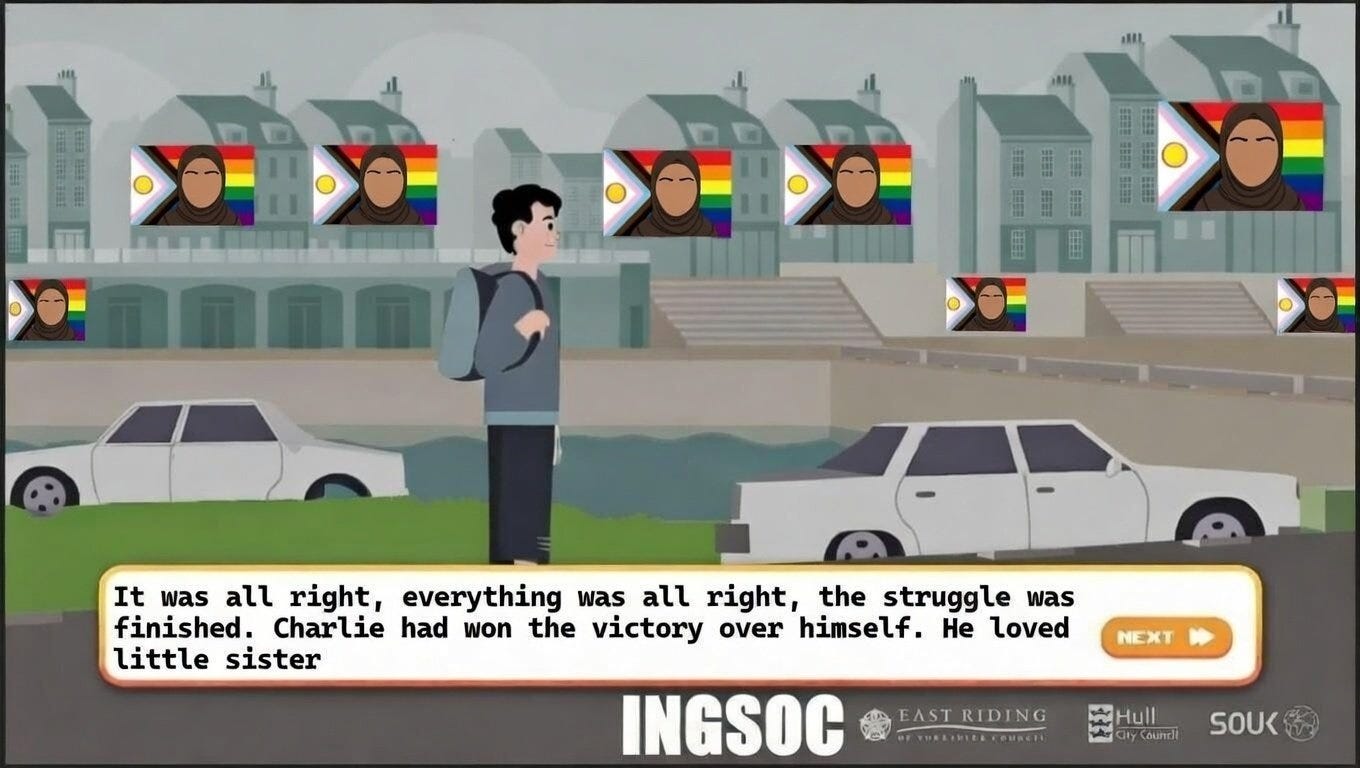 At the conclusion of his misadventures, Charlie gets referred to Prevent, who provide him (“them”) with counselling by a friendly brown man (or, in an alternate ending discovered by anons who scraped the game from Shout UK’s webpage, an extraordinarily ugly hijabi) who leads him away from extremism and helps him to learn to love Little Sister.