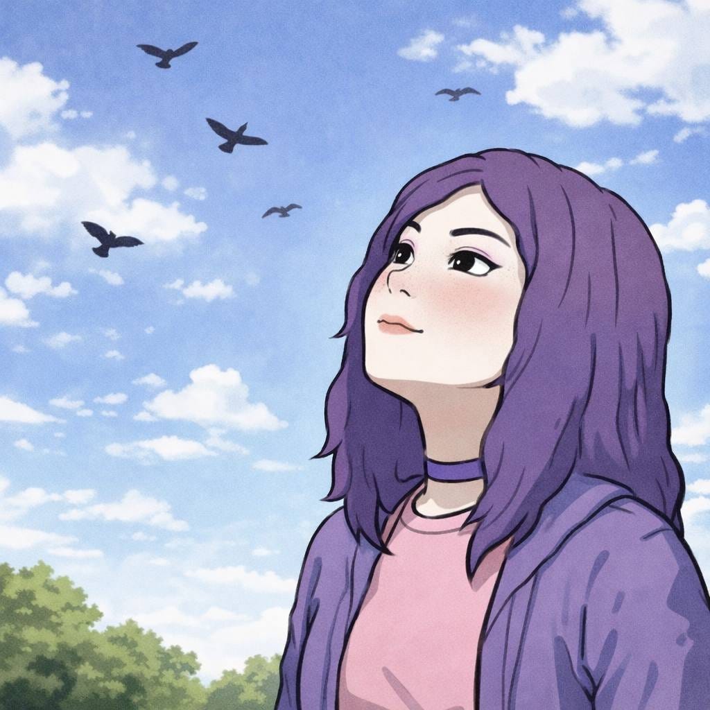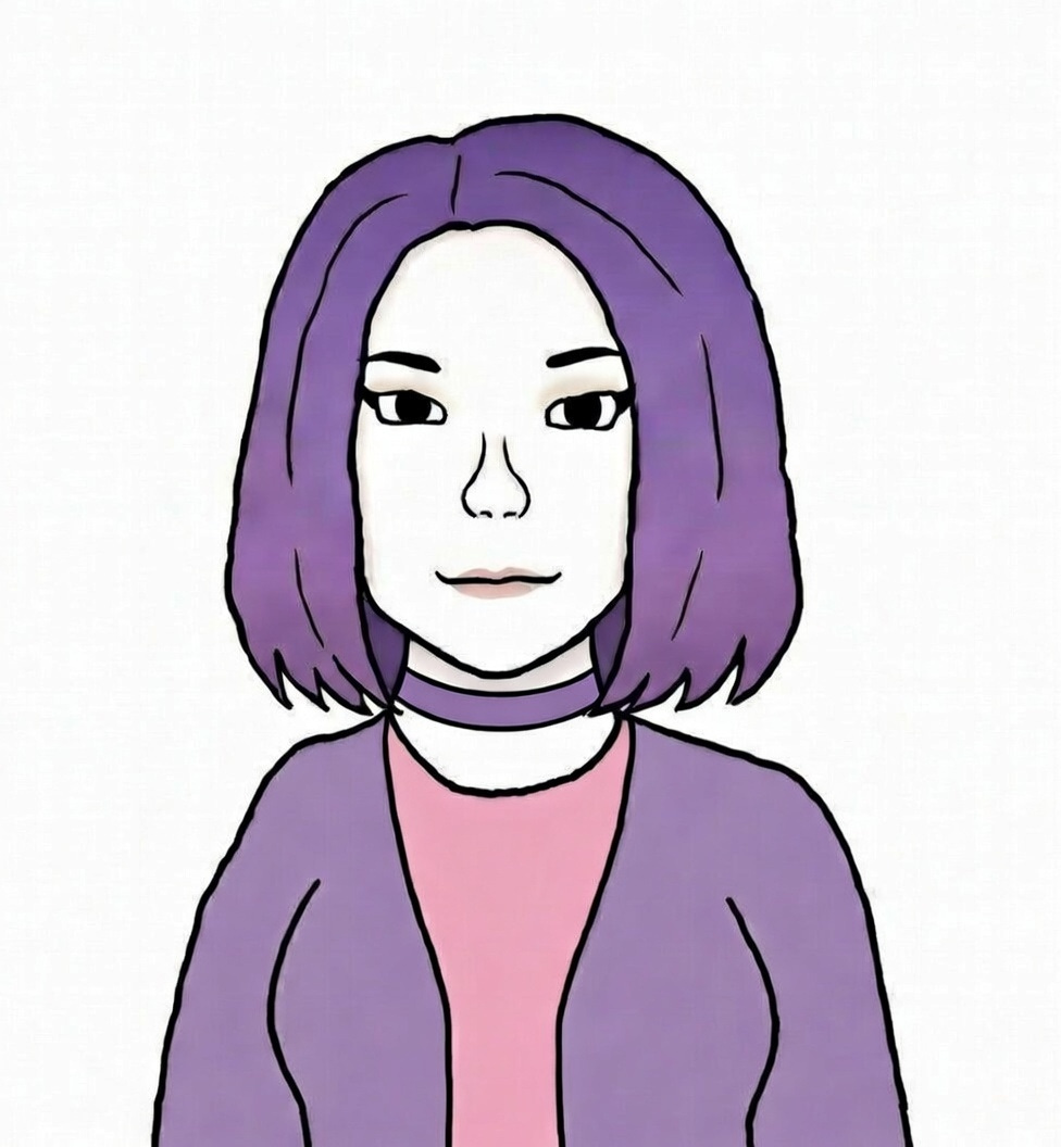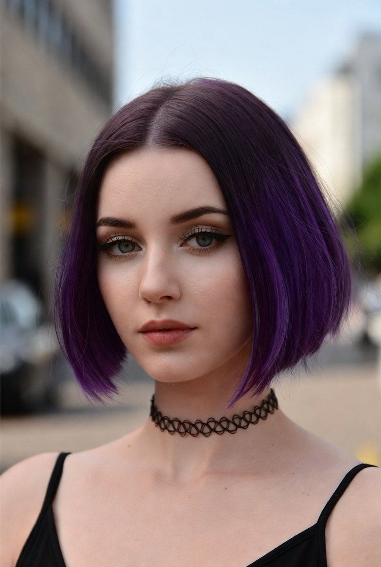 With violet hair, and pure pale skin,