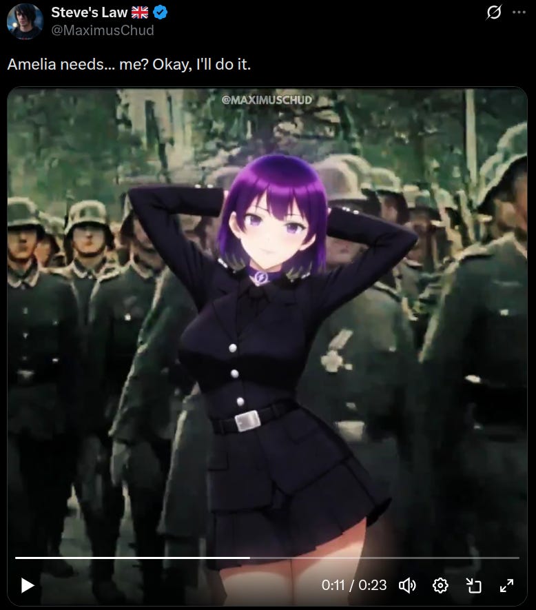 Like every established and true member of the memetic pantheon, like Pepe, Wojak, the Yes Chad, Gigachad, and all the rest, Amelia was not so much created but encountered. Obviously, like Pepe, she was in a sense invented – in her case by a bottom-feeding state propaganda agency – but her invention was almost entirely unintentional. Her original creator had no idea of the purpose that she’d serve, and it was not the moment of her creation but the moment of her acknowledgement that marked her entrance into the zeitgeist.