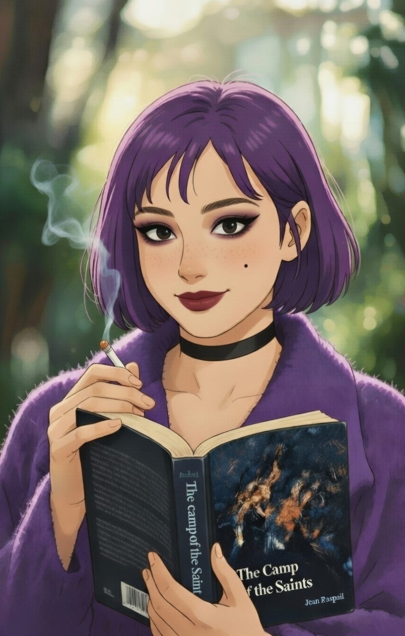 Amelia poses a question. Can we hyperstition manic pixie dream radicals into existence? This is almost the same question as: can we psyop the existing supply of art hos into adopting right-wing opinions? Can they be seduced to the dark side, which is to say to the forces of the good, the true, and the beautiful? At the individual level it’s a known phenomenon that women will tend to adjust their beliefs to match those of their boyfriends and husbands; can we do this at the collective level, as well? Can we hold frame, letting them know that gay race communism might offer them a ‘career’ but at the price of romantic loneliness ... that they have to choose between being ‘good’, and being loved? Women love nothing more than male attention. By projecting the political imperative of remigration and reconquista onto a whimsical avatar, perhaps a signal can be transmitted into the collective mind ... ‘Men want this ... you can be this ... doesn’t it look like more fun than whatever you’re doing right now?’