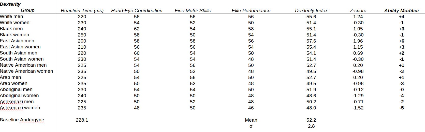 Dexterity exhibits a similar range of variability as strength: from +6 for East Asian males (this is actually the highest modifier in the entire set) to -5 for Ashkenazi women. It should be noted that there was (according to Grok) no specific reaction time data for Ashkenazim, including when checking Israeli data. However, the low dexterity assigned to Ashkenazis, and the high value assigned East Asians, does tend to fit the general stereotypes that East Asians are quite nimble, while Jews tend to be a bit klutzy, perform poorly in athletics, have low visuospatial intelligence, and so on.