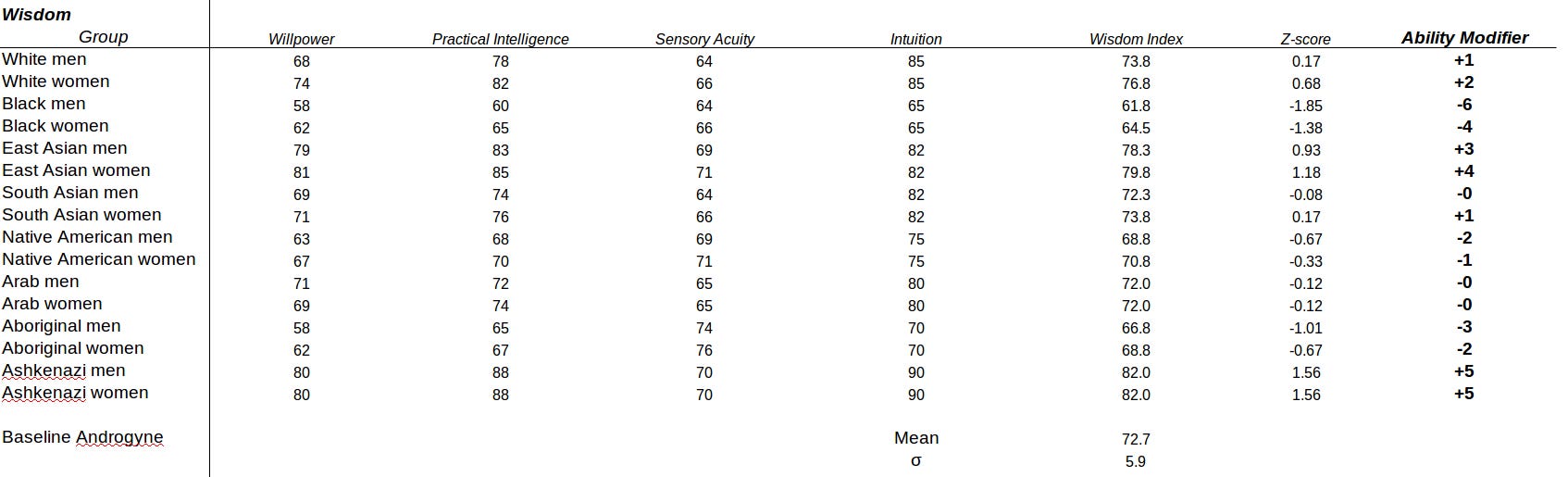 Ashkenazis absolutely dominate, with a WIS +5 modifier. Next in order are East Asians and whites, respectively, with women having a slight edge over men in both cases, largely due to the higher levels of criminality exhibited by men. Blacks are the lowest of all, with black men having WIS -6.