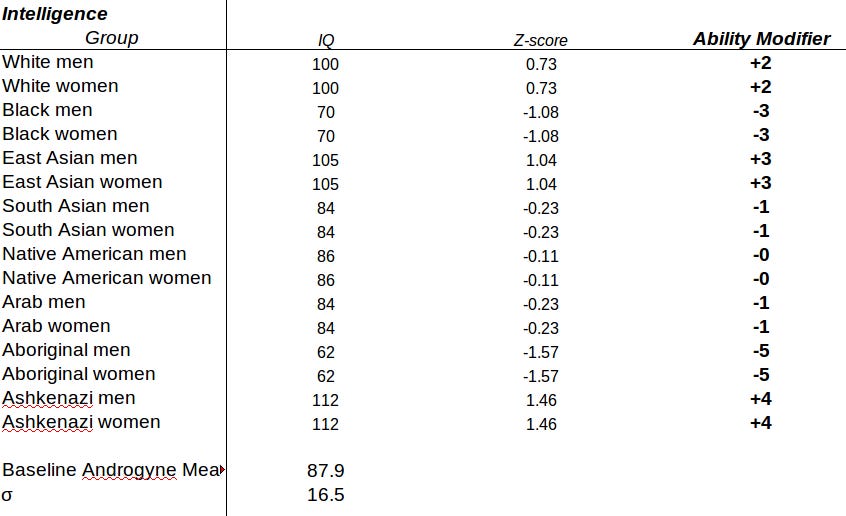 It’s worth emphasizing that the intelligence modifiers calculated from the z-scores do not assume a difference from an IQ of 100, which is technically the definition of the mean in IQ; nor do they assume a standard deviation in IQ of 15. Instead, the calculations used the IQ of the baseline androgyne (87.9, the average human is apparently a bit dullwitted) and the standard deviation across the groups (16.5, a bit larger than the number usually adopted for standard deviation in IQ). Using an average IQ of 100 as the comparison number would shift all of the modifiers in the same direction, e.g. whites are now INT +0 but blacks are -5; using 15 as the standard deviation would slightly increase the magnitude of the modifiers, e.g. blacks would then be INT -6.