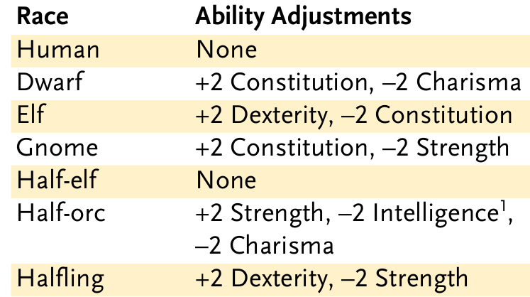 I’m quite deliberately ignoring the abomination that Wizards of the Coast has created with the 5th edition, in which if I understand correctly there are no racial ability modifiers, with each character simply getting a set number of pluses and minuses to apply willy-nilly as they see fit. Racial ability modifiers are, you see, racist.