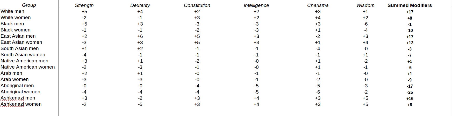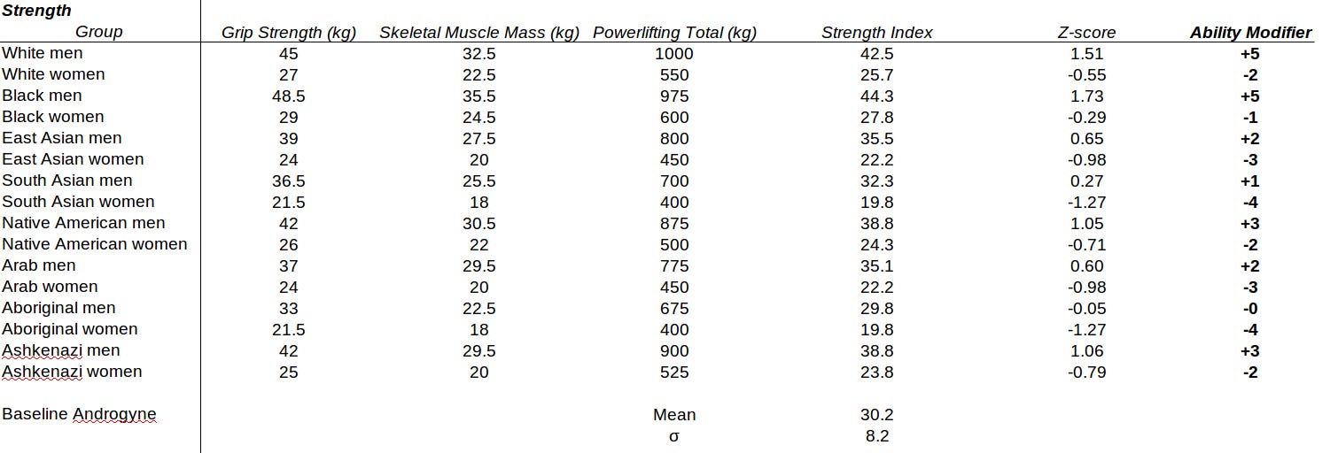 xThe first thing that we notice is that these ability modifiers are ridiculous overpowered with respect to those usually adopted in Dungeons & Dragons. The strongest playable D&D race is the half-orc, with STR +2. Relative to the androgynous human average, white and black males are, by comparison, an incredible +5, absolutely mogging every other group. Of course, the reason for this is that we are considering not only the differences between races, but the differences between the sexes, and the sexual difference in upper body strength is considerable. While white men have STR +5, white women have a -2 modifier; comparable differences are seen between the sexes across other racial groups. South Asian and Aboriginal women have STR -4, the lowest in the set; formally, this would mean that they could potentially have negative strength in a 3d6 system (in practice, the DM would simply limit the lowest possible ability level to a 1). Comparing only men to men, the largest differential (5 points) is between white and black men and Aboriginal men, who have no modifier (actually a very slight negative z-score, which rounds to 0).