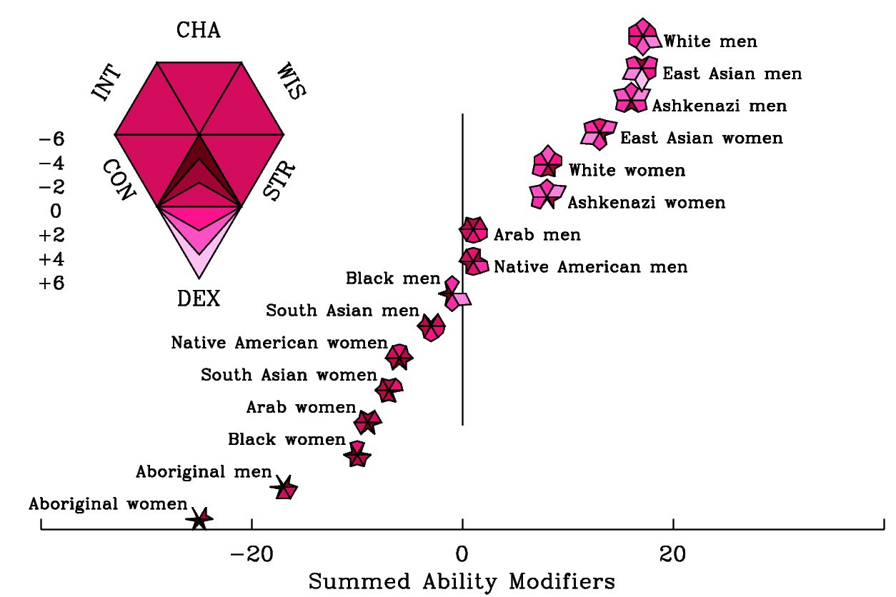 The second thing to take note of is that the ability modifiers are unbalanced to an almost comical degree. In D&D the modifiers for a given race usually sum to 0, e.g. an elf gets DEX +2 but CON -2, a dwarf CON +2 but CHA -2, and so on. This is done to keep game-play interesting. No one will want to play a race with nothing but negatives dragging his character’s ability scores down; everyone will flock to races with nothing but positives boosting their scores to superhuman levels. HBD&D, however, was not designed in a game studio, it was not play-tested, and it does not care in the slightest about fairness. As can be seen in the data visualization (and in Table 6), summed ability modifiers range from +17 for white men and East Asian men (with Ashkenazi men coming a close second at +16), to a frightening -26 for Aboriginal women. Even more unfairly, white men end up, uniquely, with positive modifiers to every single ability; conversely, Aboriginal men10 and women have negative modifiers to every ability.