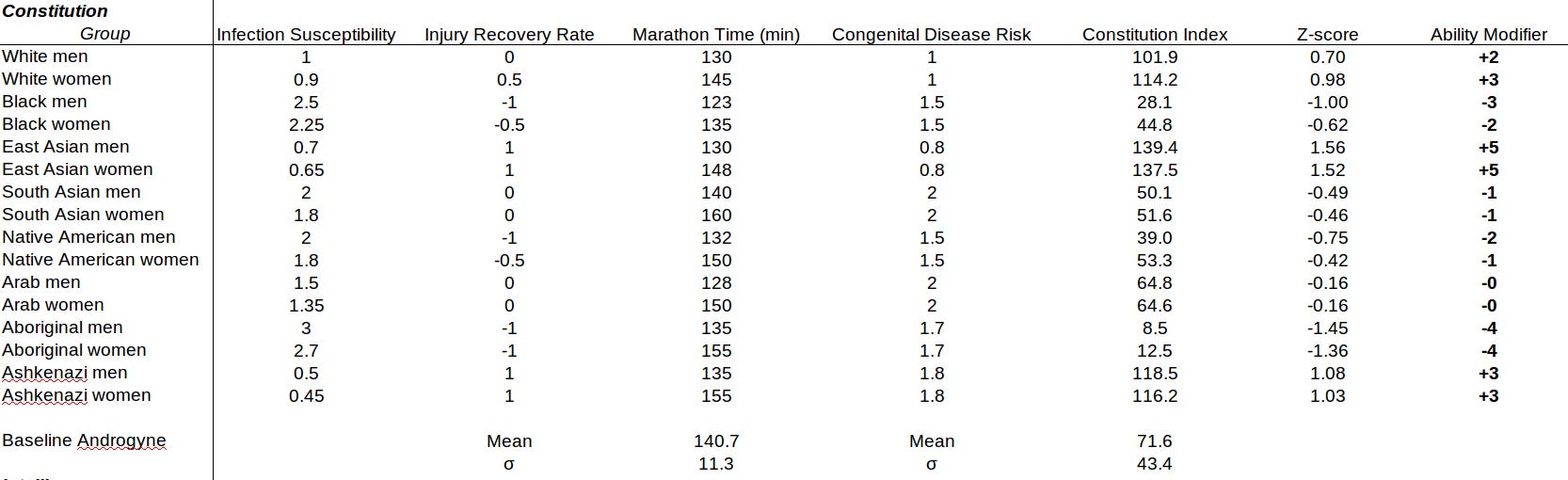 Sexual dimorphism is almost completely (but not quite) absent from constitution, in rather stark contrast to strength and dexterity. The range of racial variability, however, is as significant as it is in strength and dexterity (9 points, in this case).