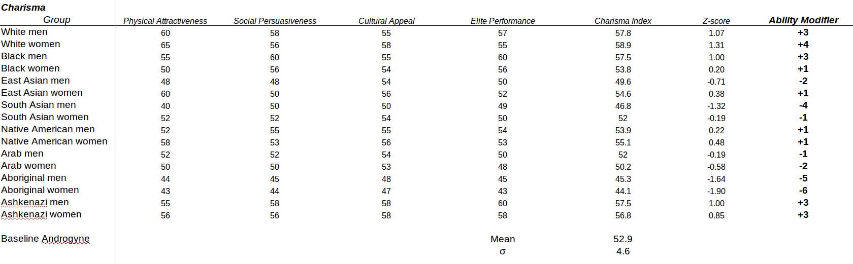 As with the previous scores, the overall spread in modifiers is 10 points. This time the largest difference is between white women, the winners of the charisma game, and Aboriginal women, its clear losers. Memes have been made about this specific difference.