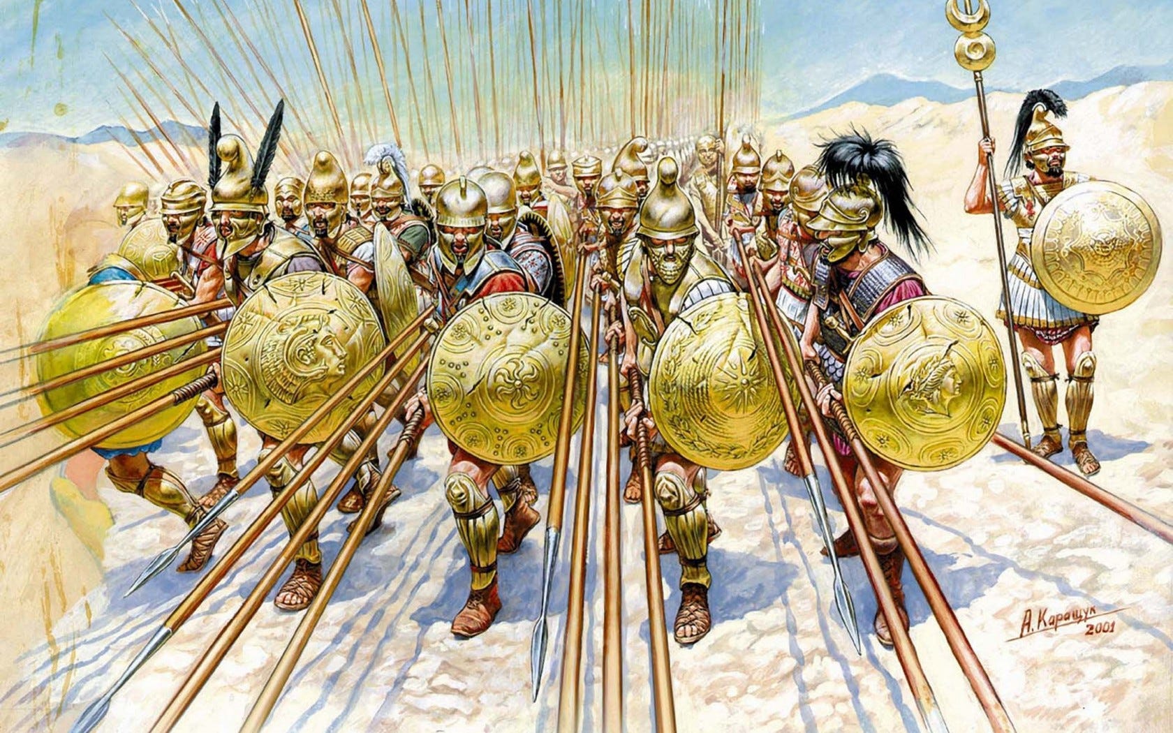 Warfare now moves on from the era of the chariot to the era of the phalanx and, later, the legion. From the point of view of bronze age militaries consisting of masses of untrained peasant conscripts providing an audience for peacocking aristocrats zipping about in their chariots - i.e. pretty much the model Xerxes was using when he invaded Hellas - the phalanx was a weird and terrifying sight: a tight knot of heavily armoured madmen sprinting across the battlefield to smash into the enemy ranks like a mailed fist, all of them trained to provide mutual protection for one another behind shield walls bristling with spears, such that getting at any one of them was probably very frustrating ... none of which prevented them from getting at you.