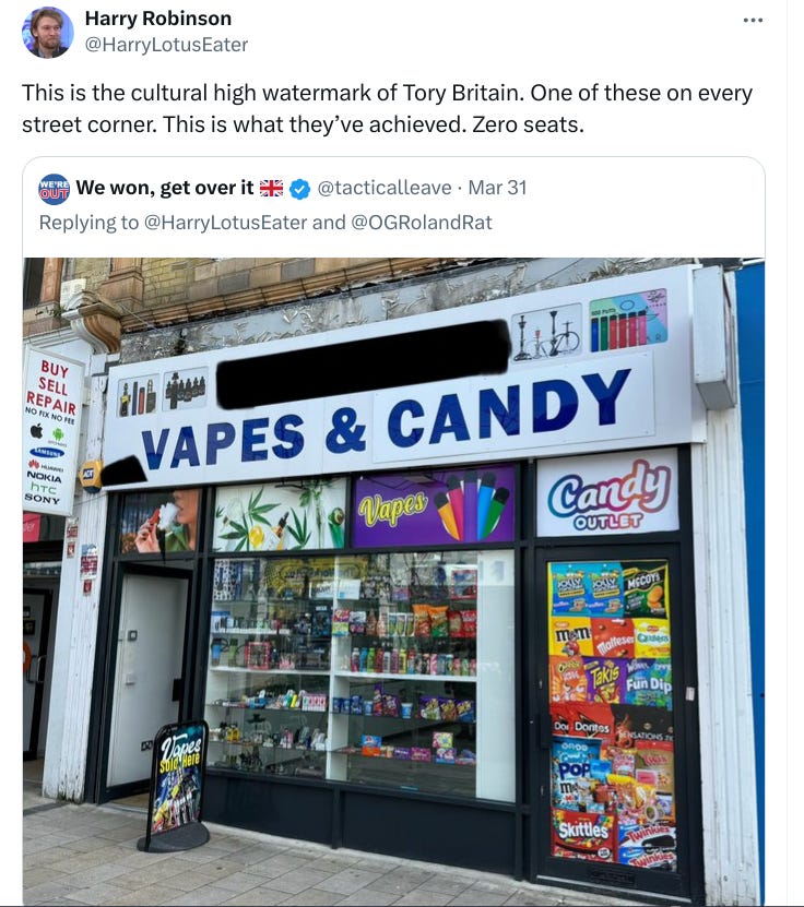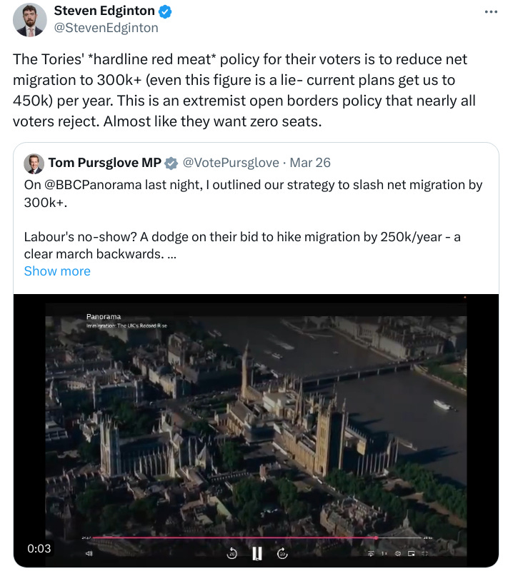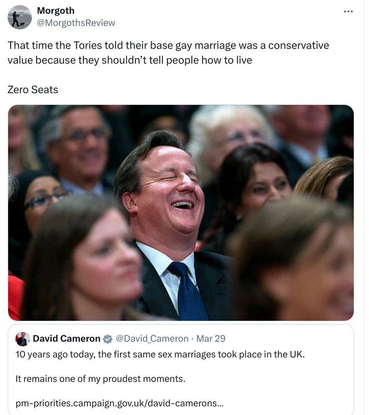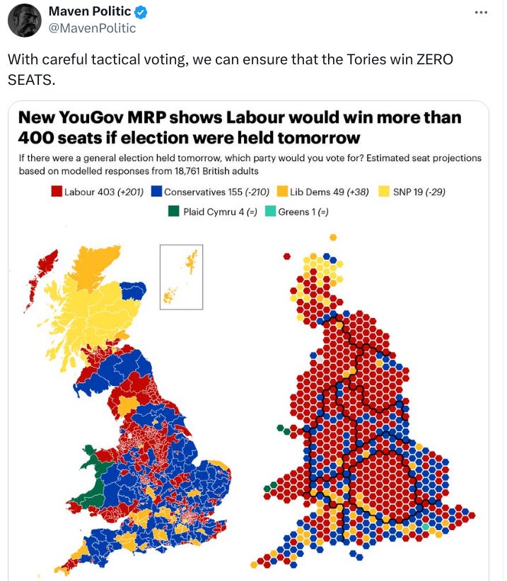 The Conservative Party has been in power in the United Kingdom since 2010. Throughout that period they have governed as Labour Lite, sweet-talking to their base about reducing immigration, backing out of the EU, and reviving the economy, all the while slow-walking Brexit, importing more Indians than Tony Blair ever dreamed, implementing Net Zero policies, and in general doing everything they can to wreck the island to an unrecoverable degree. Actions speak louder than words, and it seems that their voters have finally started to tune out their words and listen to their actions. If the choice is between Labour and Labour, you might as well stay home on election day and let Labour take all 600 seats. As Academic Agent argues, that would at the very least deprive the government of legitimacy. It would also destroy the Tories, with the possibility that something more functional might be reconstituted from the terminal wreckage of England’s oldest political party7.