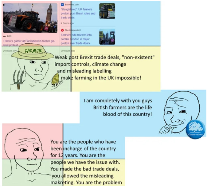 As you can see from some of the tweets, the unrest in the Tory base is not really Sunak’s fault, specifically. It’s not that the man is a gamma male whose nervous laughter carries all the charismatic appeal of a squishy banana peel at the bottom of an overripe compost bucket, although that certainly doesn’t help. It’s not his asinine proposal to ban anyone born after 2009 from purchasing tobacco products, nor his abortively expensive attempt to use Rwanda as a holding pen for migrants as their asylum claims are processed, nor his failure to make Brexit happen in any meaningful way, nor his continued pursuit of economically suicidal and scientifically discredited ‘climate’ initiatives.