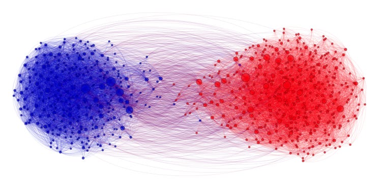 And yet, when we look at the ideological structure of the Internet, we almost invariably find network graphs like the following: