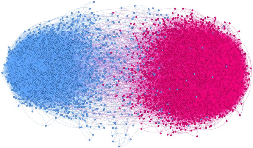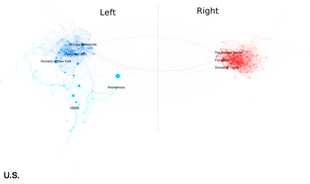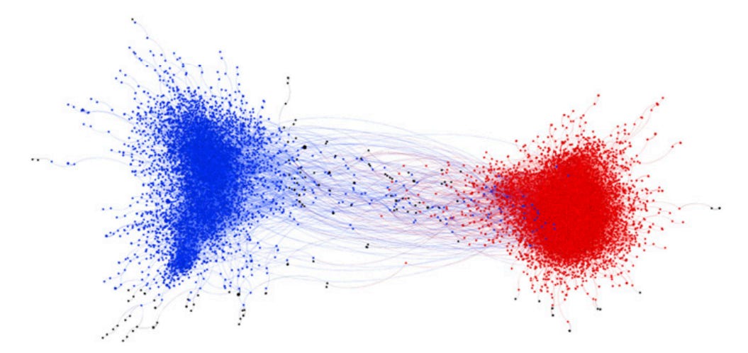 These network graphs demonstrate that, regardless of the ideological incoherence of the right – or, for that matter, the left – there very obviously are two large, and largely separate, social networks. This has remained true for at least twenty years; it’s true across different platforms; it’s true across different cultures, speaking different languages. Wherever you look, whenever you look, humans seem to naturally self-organize themselves into two ideologically opposed solitudes, densely connected internally but only weakly coupled between themselves.