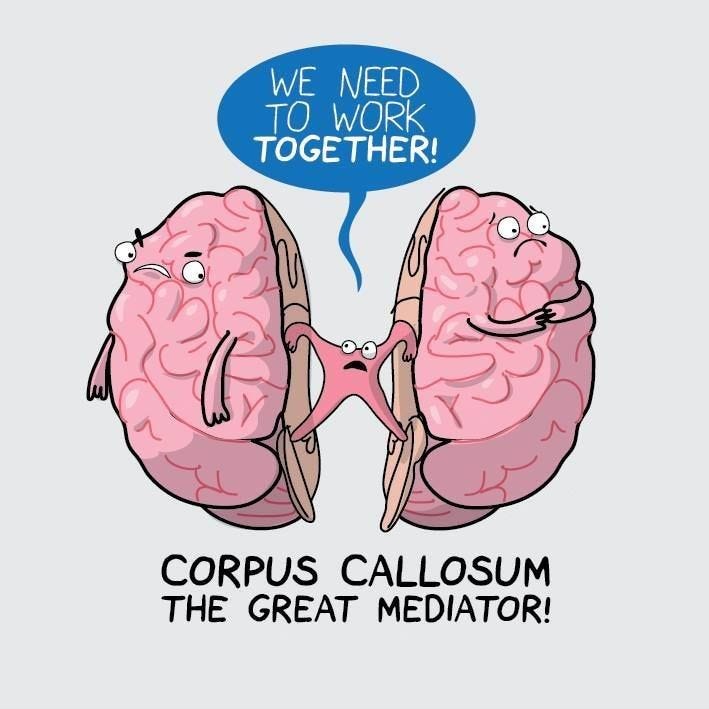 Importantly, while the brain hemispheres are visually symmetric, they are functionally asymmetric. Each hemisphere handles very different aspects of cognition. The hemispheres are densely connected internally but only weakly connected to one another via the narrow bridge of the corpus callosum, enabling each to work largely independently of the other, which is for the best because their cognitive modes are quite distinct and largely incompatible, as a result of which they tend not to like one another very much.