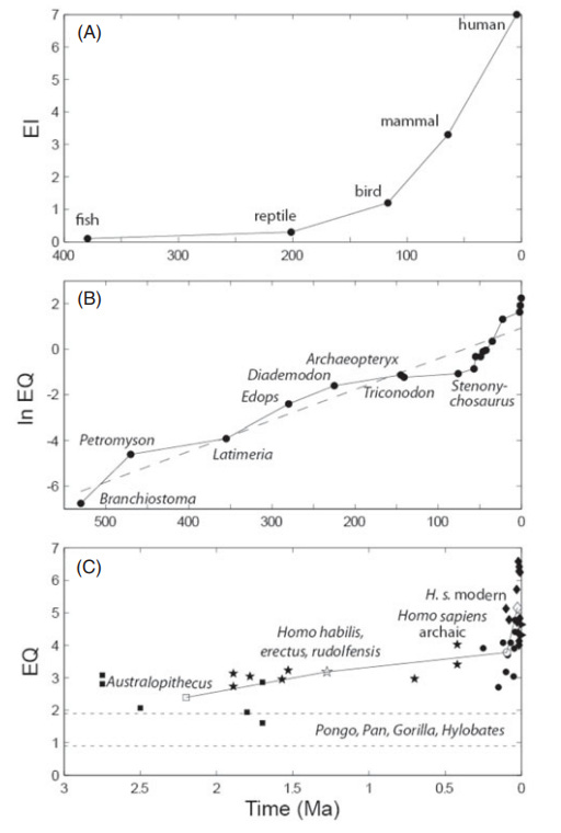 We have excellent reason to expect that life should be extremely common, but what about intelligent life? The steady increase in encephalization over evolutionary time – in other words, the tendency of brains to become larger, presumably since intelligence is almost always a competitive advantage – suggests that self-aware, tool-using intelligence should invariably develop (given time and conditions favourable to complex, multicellular life).