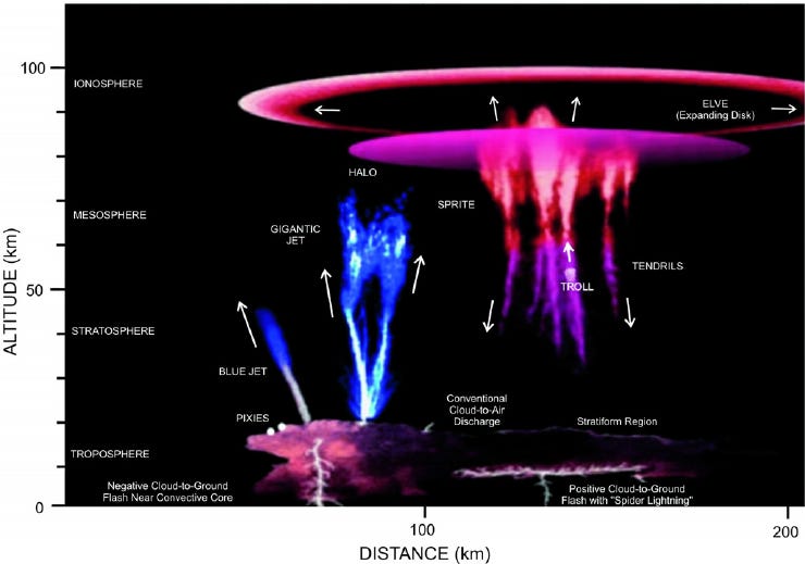 It wasn’t until 1989 that a physicist accidentally caught sprites on camera, thereby ‘discovering’ the phenomenon. Once science accepted the phenomenon was real, it could be investigated systematically. Now we know that these discharges – the taxonomy has been expanded beyond sprites, to include trolls, ghosts, pixies, and ELVES3 – go all the way up into space.