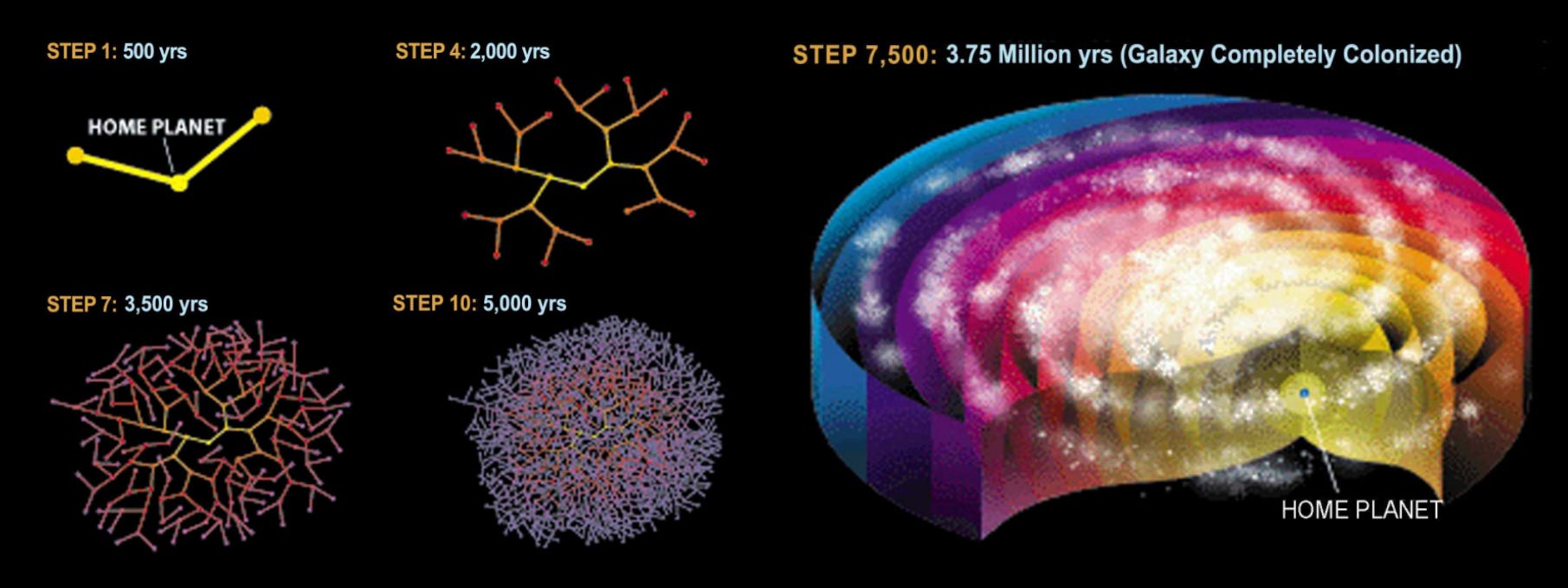 That temporal asymmetry doesn’t change much if colonization wave moves at the much slower velocity of the Voyager spacecraft, humanity’s first and so far only interstellar probes, which are leaving the solar system at 17 km/s and could reach the nearest star, α Centauri, in about 75,000 years (if they were heading towards it, which they aren’t). A species limited to Voyager speeds would colonize the Galaxy in about 4% of the Galaxy’s age.