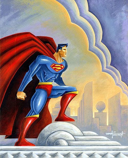The early twentieth century was the era of Nietzsche’s triumph. Art nouveau, art deco, expressionism, cubism, futurism, surrealism, and jazz all carried with them a Dionysian spirit, a sense of wild freedom, a tossing loose of structure and constraint, an eager grasping after new possibilities. In literature we see the rise of the rock-jawed Captain-Doctor Danger archetype, with an eyepatch, a zepellin, and a death ray, both a brilliant man of science and a bold man of action. This type, adapted through endless variations across the genres of adventure fiction, is quite clearly a representation or vulgarization of the ubermensch, and of course his most powerful version is universally known to be Superman, which is just another way of saying Ubermensch. This is all but explicit in the works of Ayn Rand, whose Fountainhead and Atlas Shrugged are hymns to the emancipation of ubermenschen, for all that her philosophy of Objectivism explicitly repudiated Nietzsche’s irrationalism.
