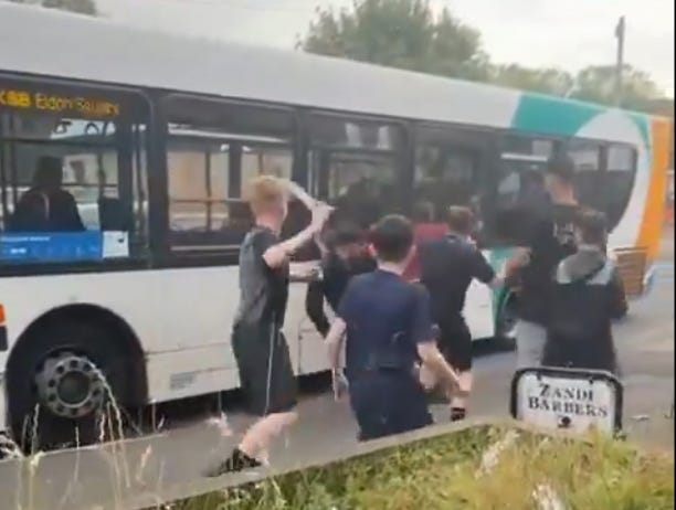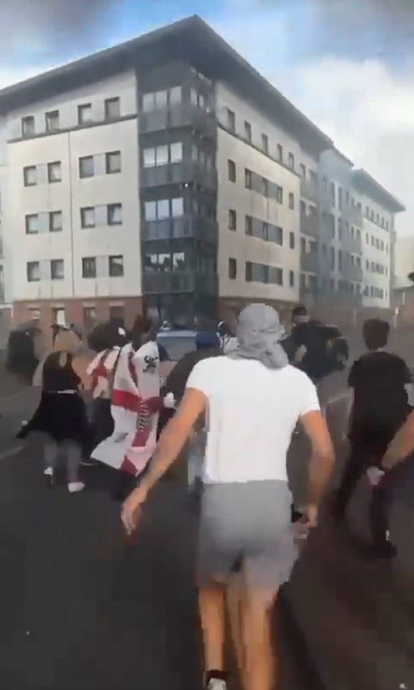 The natives are not taking that lying down. In Hull, a car reportedly operated by immigrants was seen driving over people, leading to an angry mob smashing it to scrap, pulling out the occupants, and stabbing them. All reportedly taking place in the context of migrant hotels being burned, shops being looted and burned, and widespread street fighting between English and immigrant (that last link is from a communist, so he may exaggerate).