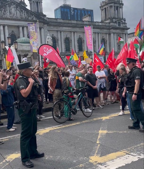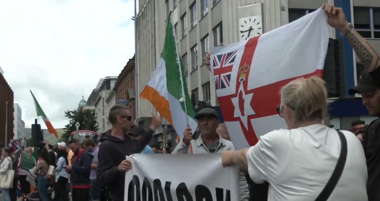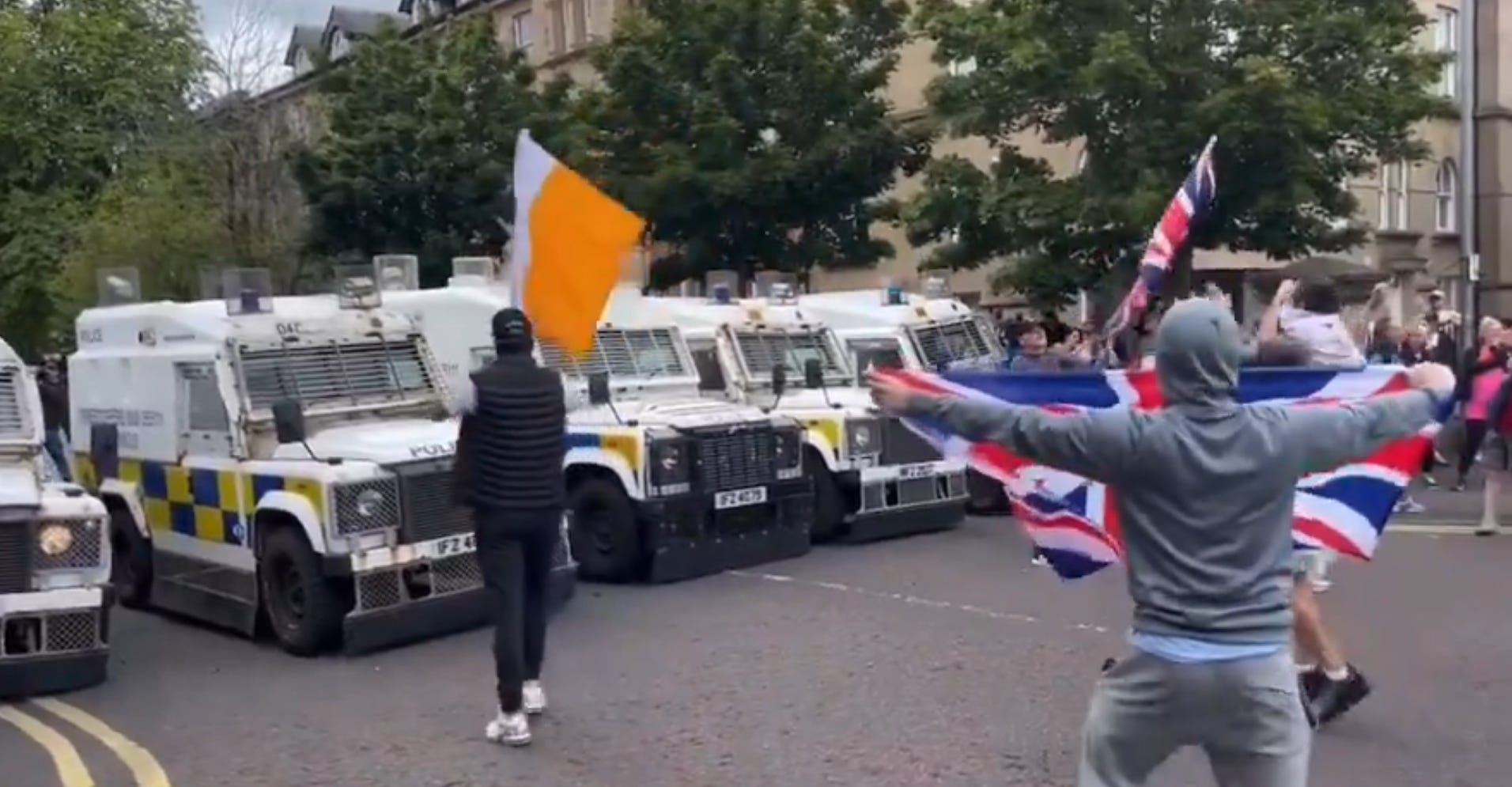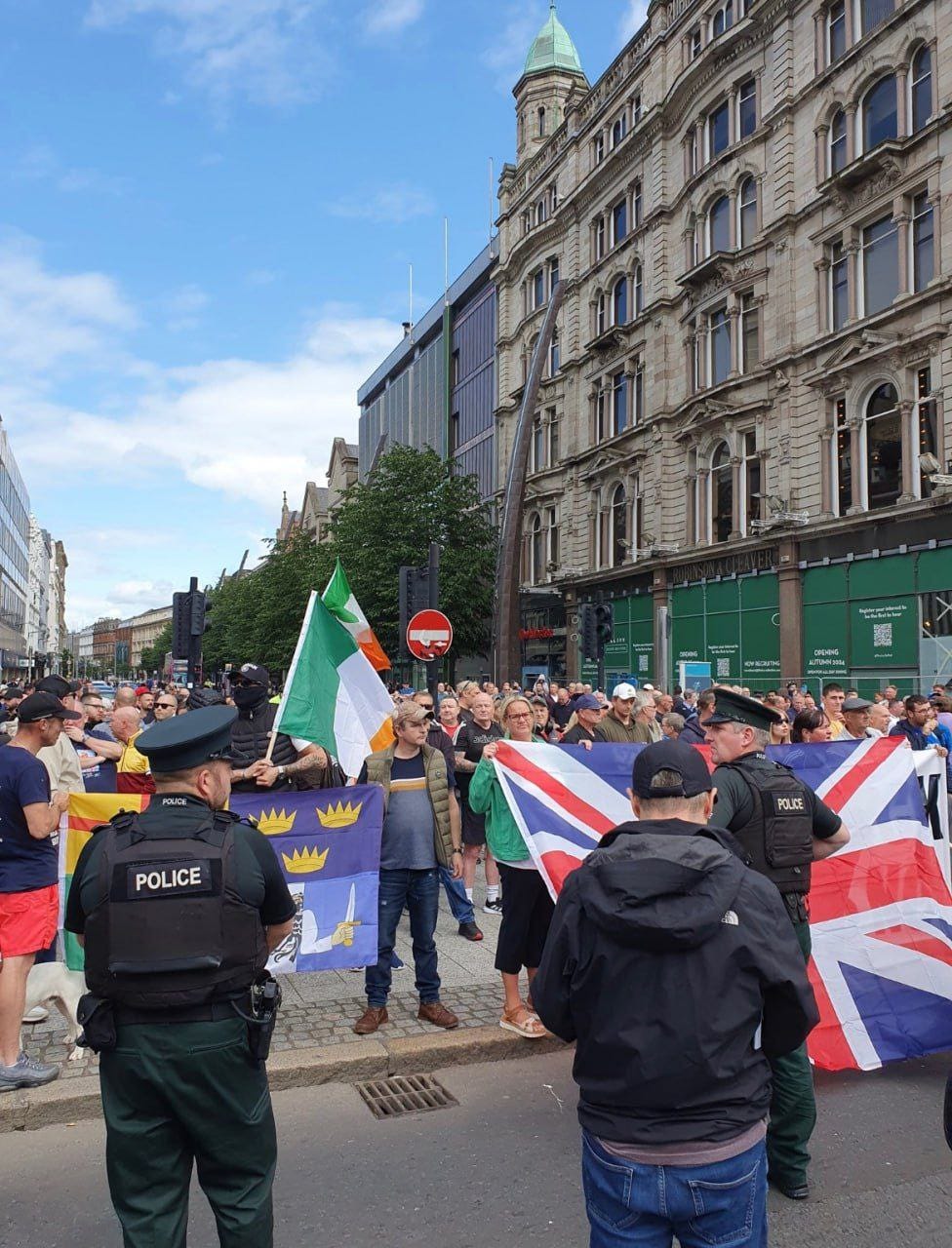 Meanwhile in Belfast, the Union Jack, the Ulster Loyalist Flag, and the Green, White, and Orange or Ireland were seen on the same side of a protest, which you really need to pause to take in the incongruity of considering that these sides hate one another so much that they maintain separate neighbourhoods so they don’t throw molotovs at each other too often.