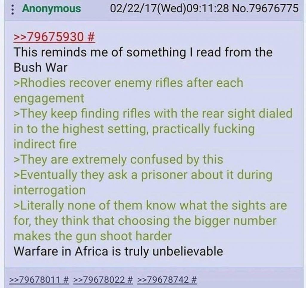 The Rhodesians did not give up easily. They fought the Bush War for a decade, desperately outnumbered, and equipped with relatively primitive weaponry. Fortunately for them their Afro-Marxist opponents had only the haziest concept of the effective use of their modern weaponry and generally only hit their targets by accident. One amusing account described how the rifles captured from the Afro-Marxists all had their iron sites turned up to the maximum setting, i.e. 1000 yards or something; this was very puzzling to the Rhodesian soldiers, who questioned captured blacks to try and discern the purpose of this strange practice. It turned out the blacks had no concept of the intended function of iron sights, and had decided that the numbers were gradations of shooting power – turning it up to the maximum setting, they believed, meant that their rifles would shoot harder.