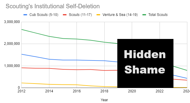 The BSA – sorry, Scouting America1 – didn’t publish annual membership reports from 2020 to 2022, I imagine out of embarrassment. During this time, the Mormons, who used Scouting as a youth program for its boys, took their 400,000 members, and their money, and left.