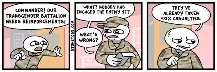 The military has responded by lowering training standards. Don't let the barely acceptable be the enemy of the mediocre and all that. That's also been driven by ideological concerns. It turns out that, no, we're not all alike, and the female of the species really isn't set up physically for the rigours of combat. Nor, for that matter, are the various sub-species of H. sapiens sapiens intellectually or temperamentally interchangeable. None of which matters to the zampolit, whose cadres of DIE commissars demand equal representation throughout the forces - and if standards have to be reduced to make sure the necessary quantity of The Diversity passes, indeed if The Diversity must be physically carried across the finish line by their instructors, then so be it, bigot.